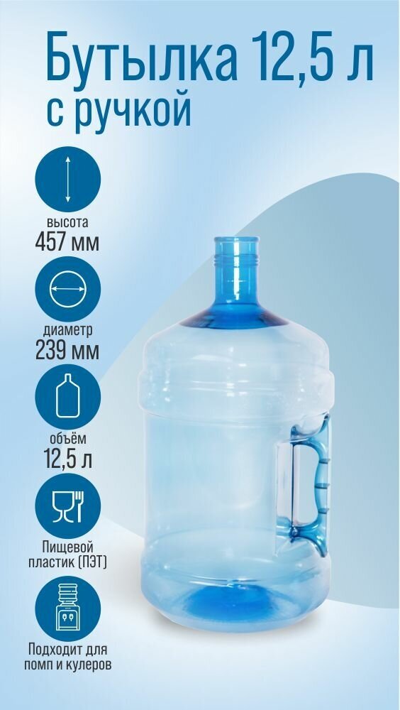 | Дополнительная информация | бутыль для воды может использоваться повторно, ручка не требует промывки, бутыль после использования в домашних условиях можно промывать содой с водой, бутыль подходит для всех стандартных помп и кулеров |