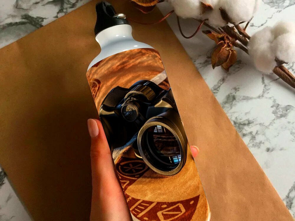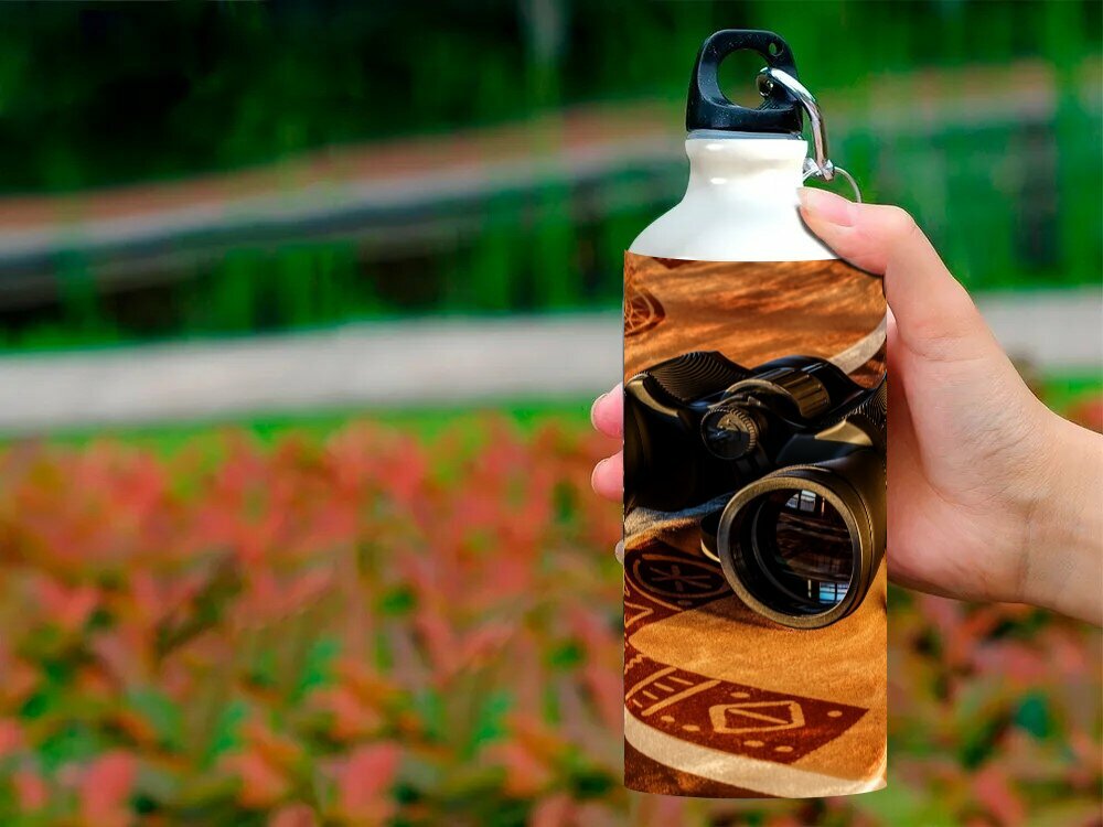 Купить Бутылка фляга для воды "Бинокль, линзы, зрение" 750 мл. с карабином и принтом