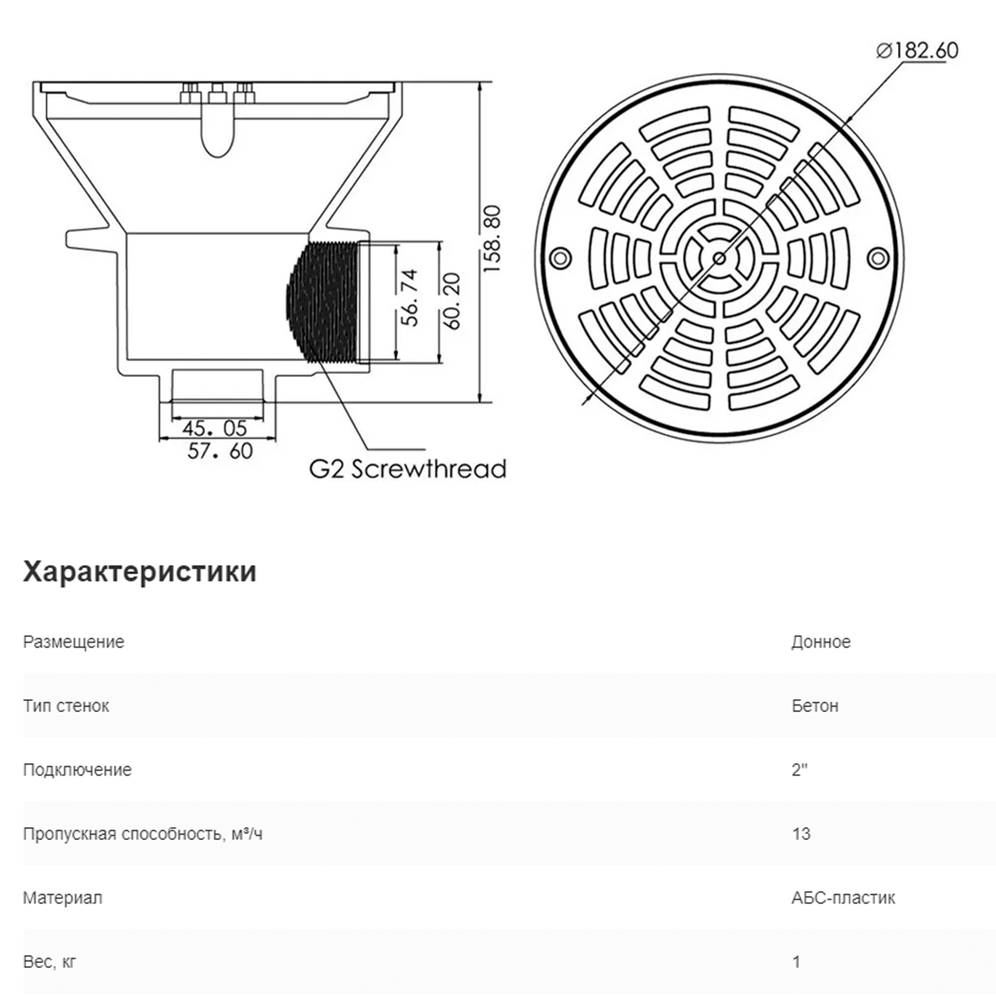 Слив донный (водозабор) под плитку / бетон - 15 м3/ч, d183мм, ВР 2", ABS-пластик - EM2838, Emaux интересное: