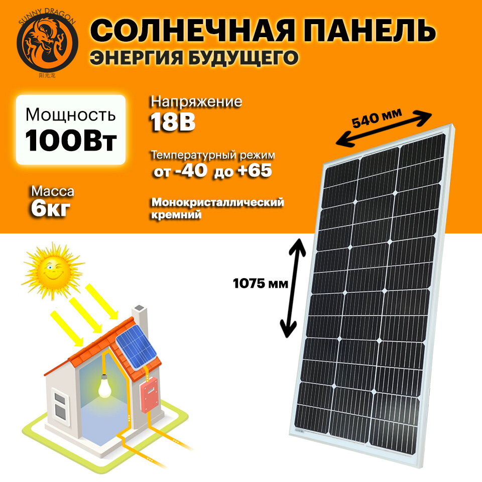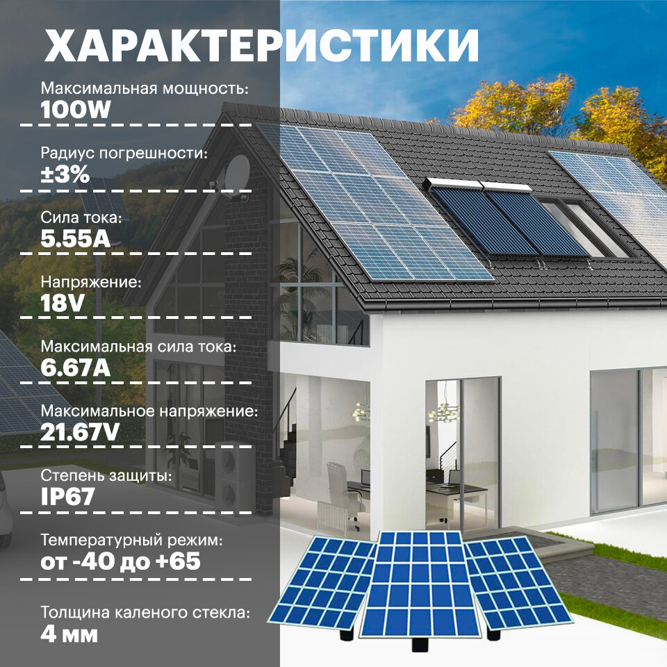 | Подробная комплектация | Монокристаллическая солнечная панель (батарея) 100Вт. 1075х540х30мм. - 1шт |