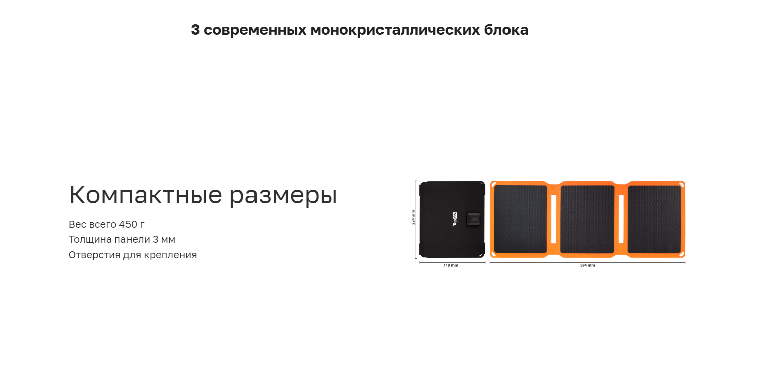 | Подробная комплектация | Солнечная батарея TOP-SOLAR-15 15W USB 5V 3A, влагозащищенная IP67, складная на 3 секции |
