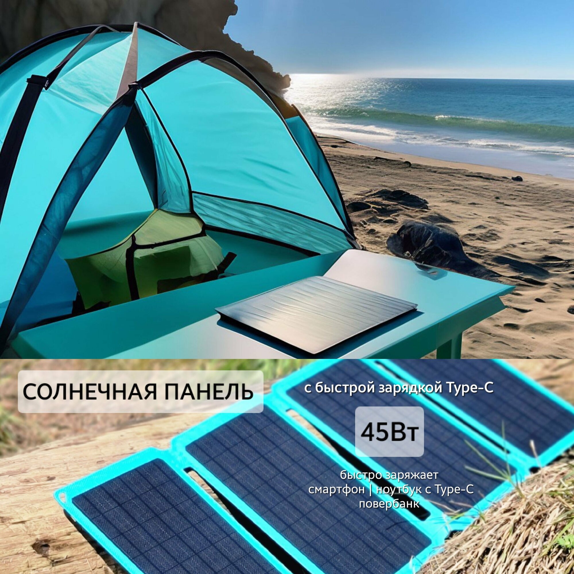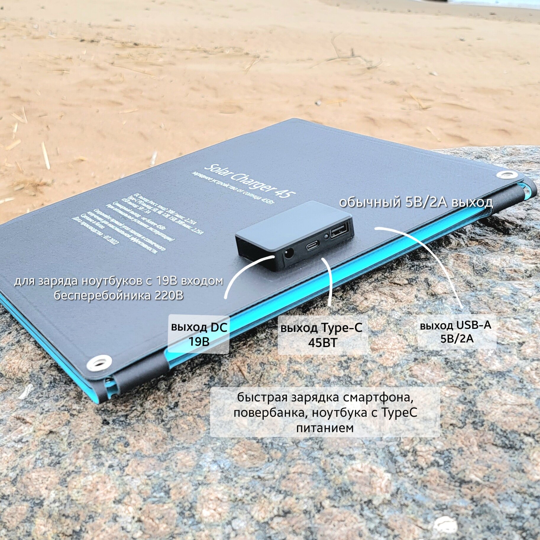 | Дополнительная информация | Портативная складная солнечная панель 45Вт с TypeC быстрой зарядкой смартфонов и ноутбуков Macbook Air, Xiaomi, Huawei, Honor и др. ETFE ламинация. |