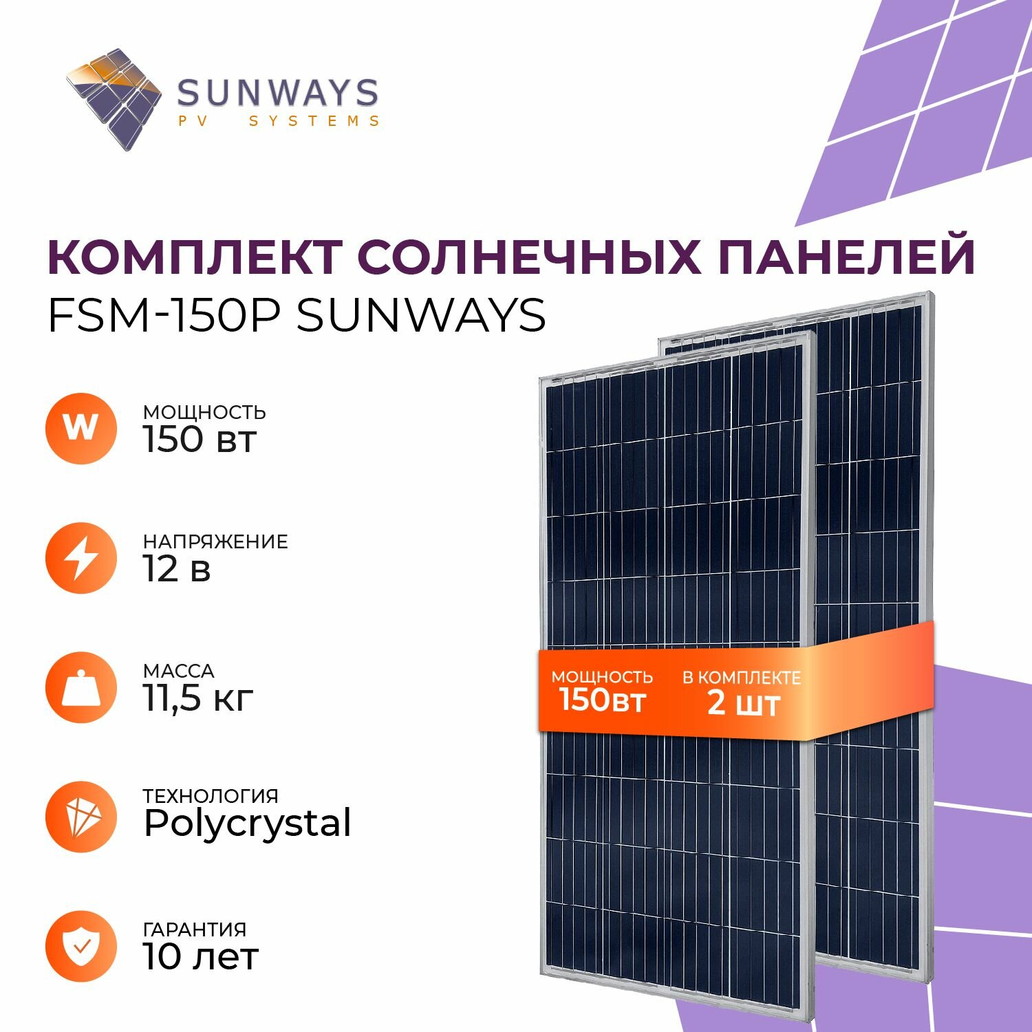 Купить Комплект солнечных панелей Sunways FSM 150P, солнечная батарея для дома, для дачи, 12В (2 шт в комплекте)