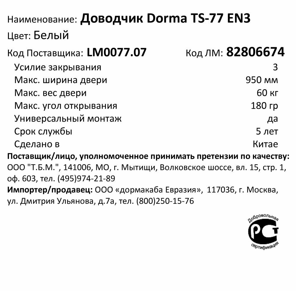 | Дополнительная информация | Доводчик дверной Dorma TS-77 EN3 максимальная нагрузка 60 кг алюминий цвет белый |
