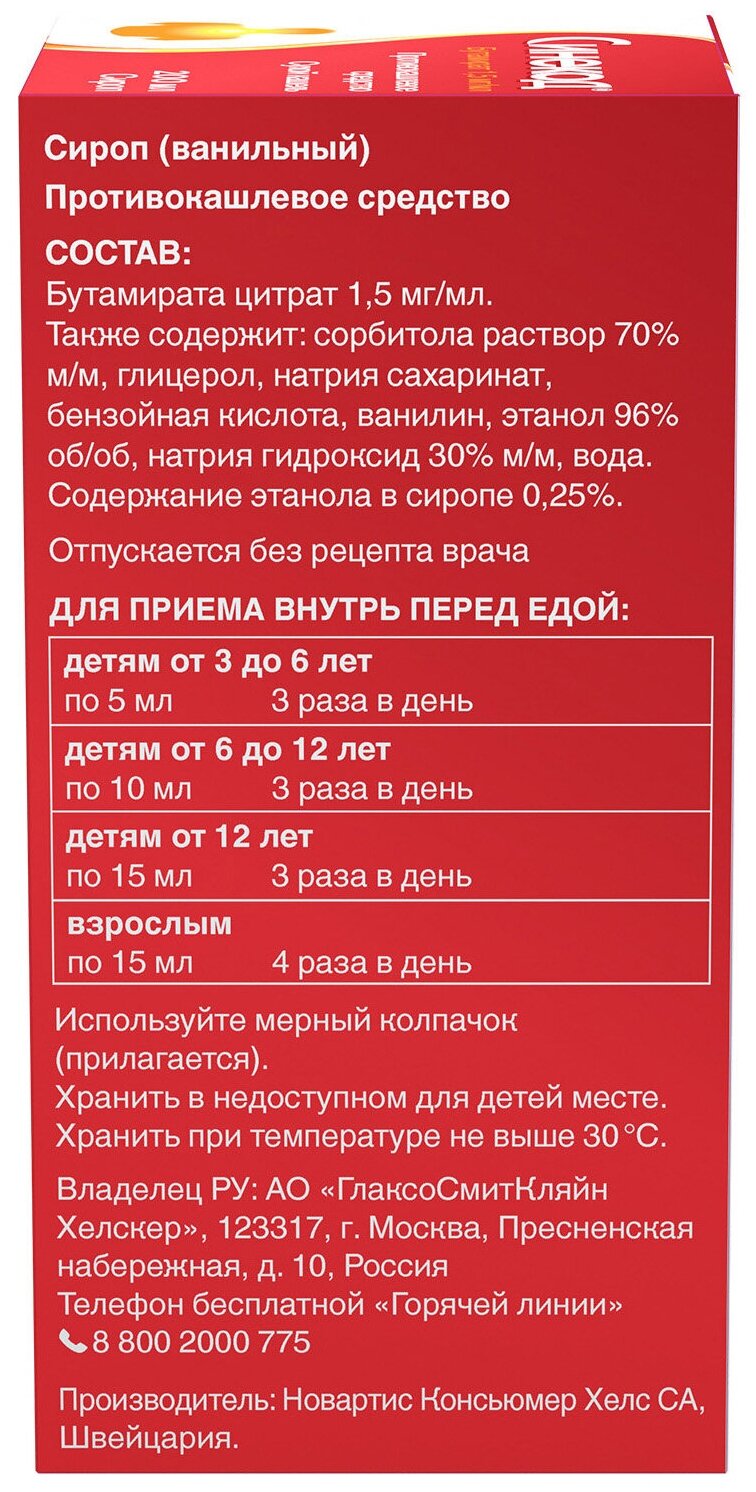 | Способ применения и дозы | Препарат принимают внутрь перед едой.Если кашель сохраняется более 7 дней, то следует обратиться к врачу.СиропПациентыРежим дозированияДети от 3 до 6 летпо 5 мл 3 раза/сутДети от 6 до 12 летпо 10 мл 3 раза/сутДети 12 лет и старшепо 15 мл 3 раза/сутВзрослыепо 15 мл 4 раза/сутПри приеме сиропа следует использовать мерный колпачок (прилагается). Мерный колпачок следует мыть и сушить после каждого использования.Капли для приема внутрьПациентыРежим дозированияДети от 2 месяцев до 1 годапо 10 капель 4 раза/сутДети от 1 года до 3 летпо 15 капель 4 раза/сутДети от 3 и старшепо 25 капель 4 раза/сутПеред применением препарата у детей в возрасте до 2 лет следует проконсультироваться с врачом. |