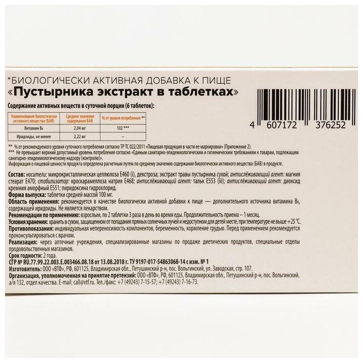 | Показания к применению | В качестве биологически активной добавки к пище — дополнительного источника витамина В6, содержащей иридоиды. |