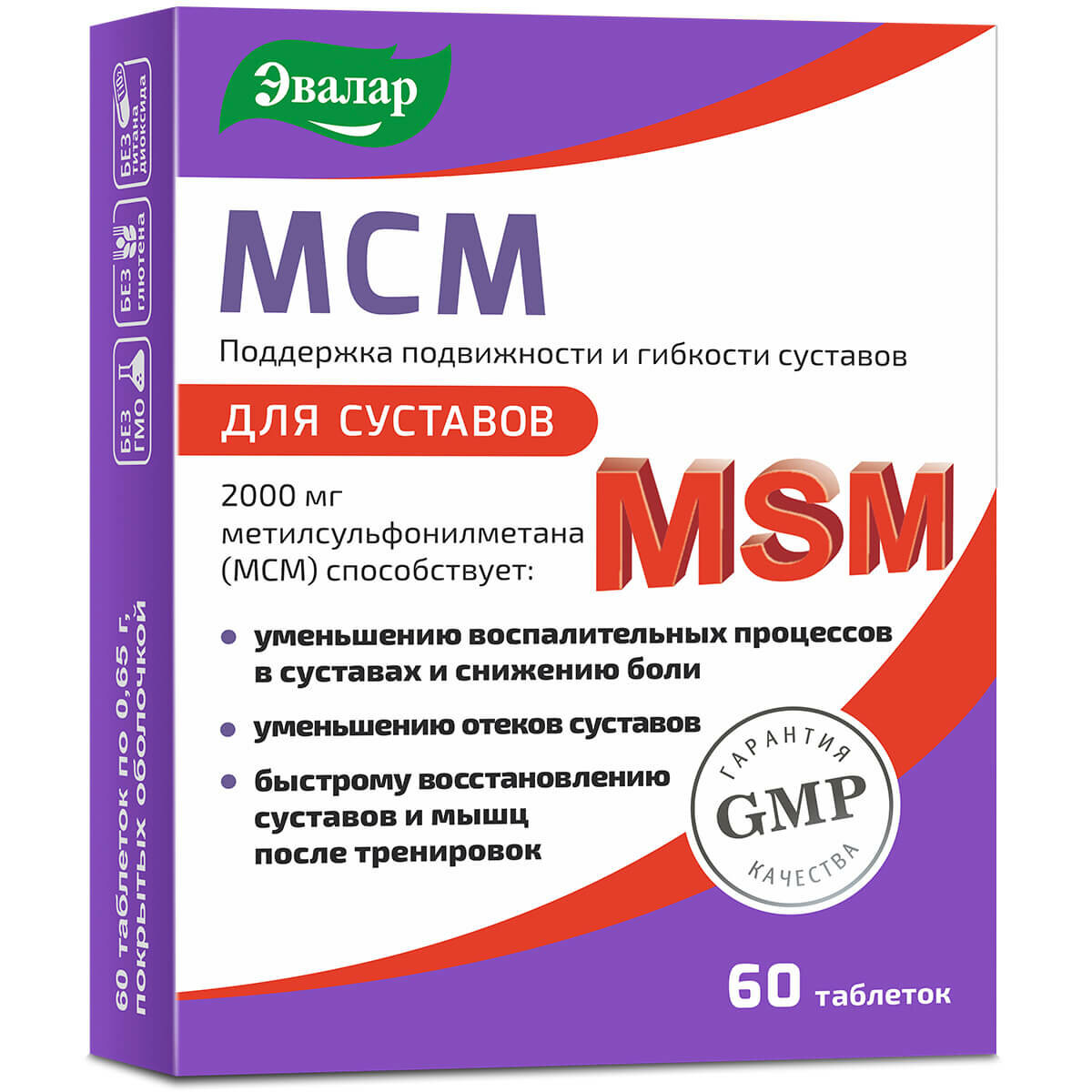 | Состав | Метилсульфонилметан (МСМ), целлюлоза микрокристаллическая (носитель), компоненты пленочного покрытия (пищевые добавки): гидроксипропилметилцеллюлоза (загуститель), диоксид титана (краситель), полиэтиленгликоль (глазирователь), гидроксипропилметилцеллюлоза (загуститель); диоксид кремния аморфный (агент антислеживающий), кроскарамеллоза (носитель), стеарат магния и стеариновая кислота (агенты антислеживающие). |
