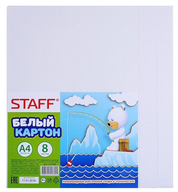 Белый картон STAFF, A4, 8 л. 1 наборов в уп.