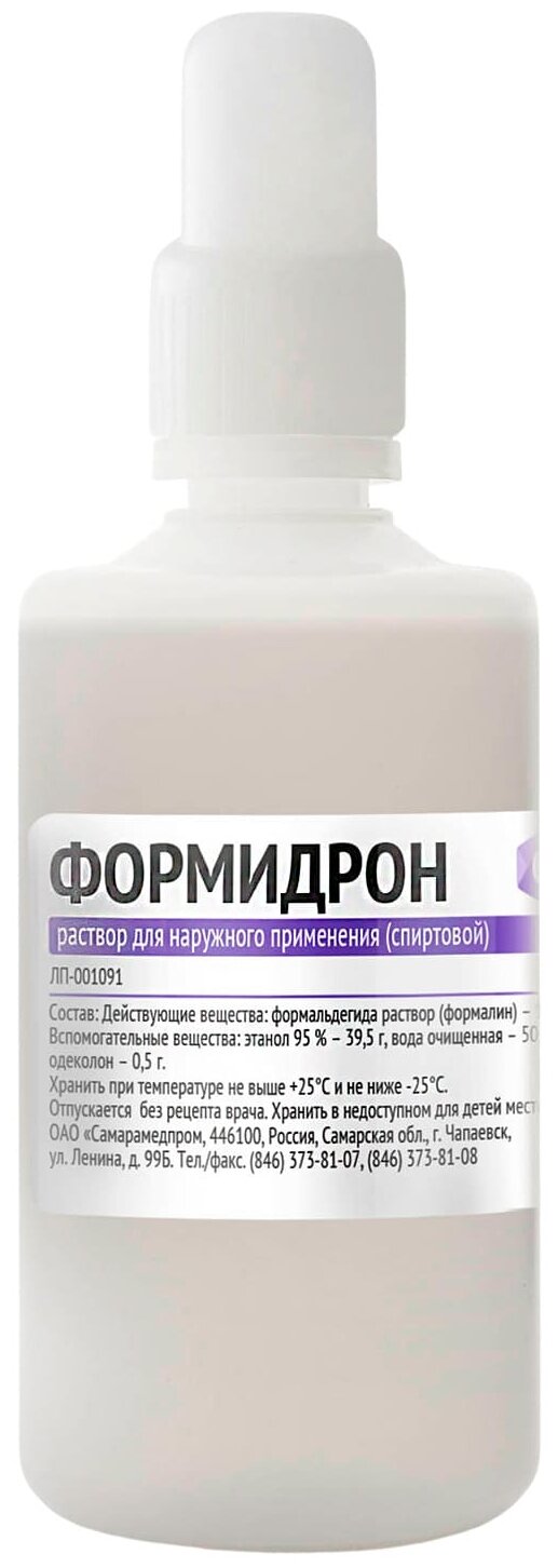 | Состав | действующие вещества: формальдегида раствор (формалин) - 10,0 г; вспомогательные вещества: этанол 95 % - 39,5 г; вода очищенная - 50,0 г; одеколон - 0,5 г. |