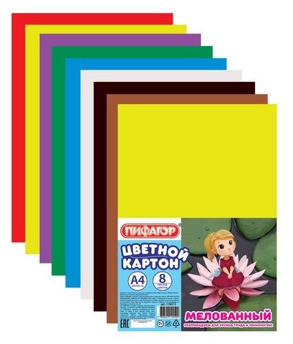 Картон цветной А4 мелованный (глянцевый), 8 листов 8 цветов, пифагор, 200х283 мм, "Дюймовочка", 128013 интересное: