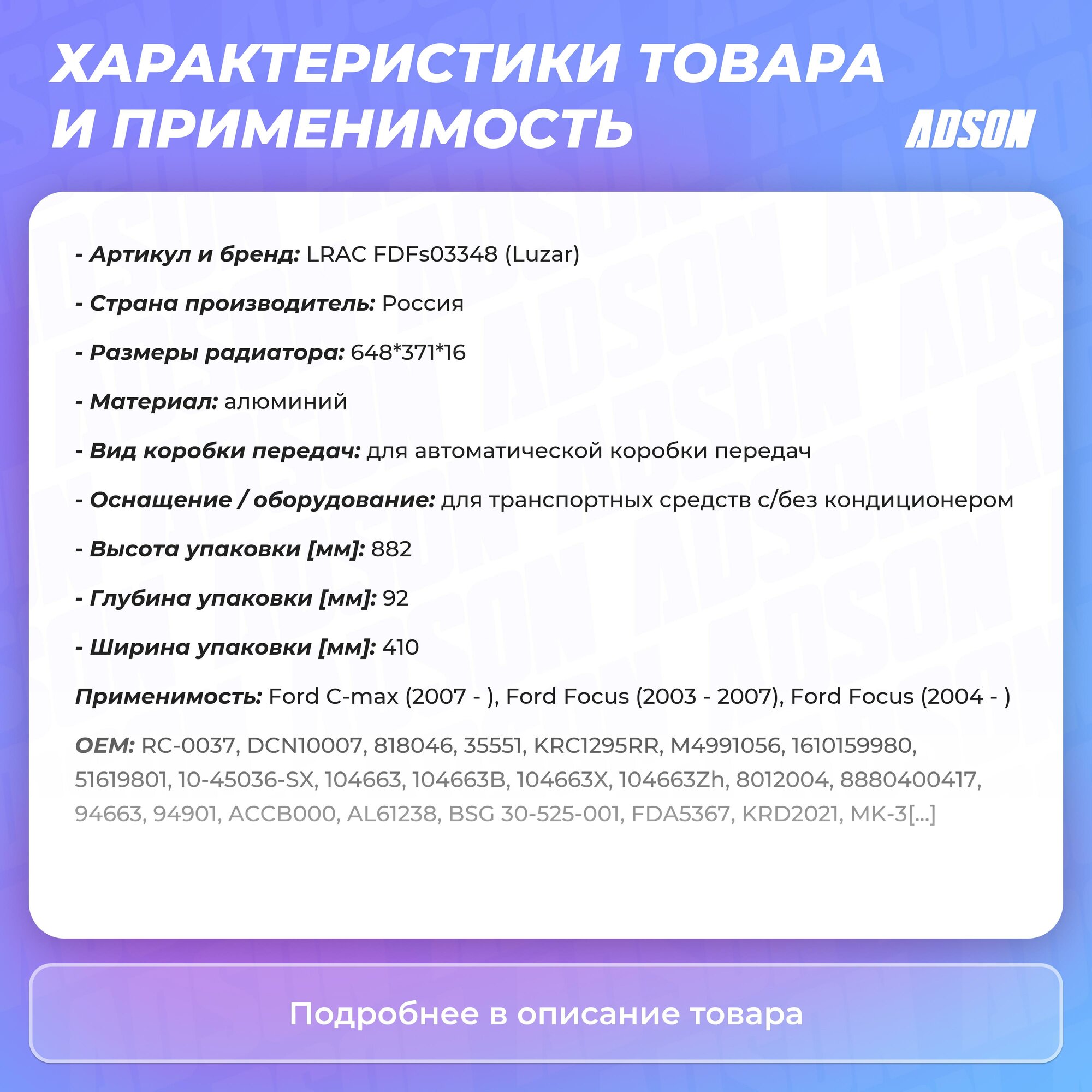 | Подробная комплектация | Радиатор кондиционера,Паспорт изделия |