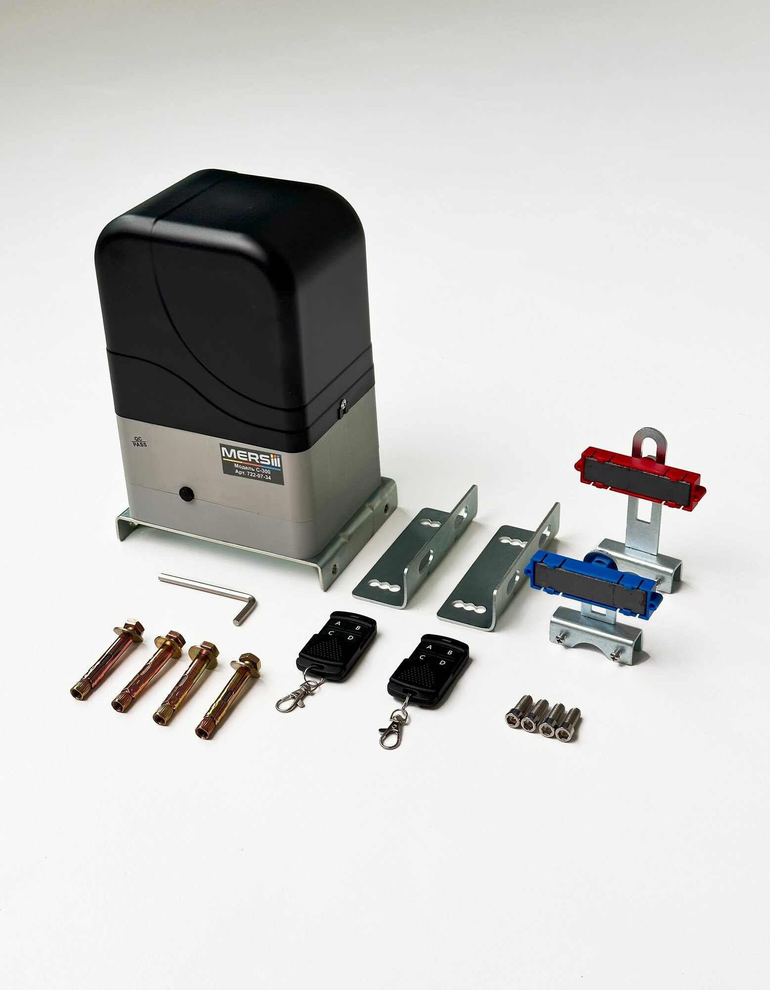| Подробная комплектация | Привод MERSIII C-300 -1 шт. Запрограммированные 4-х канальные пульты- 2 шт. Набор крепежей- 1 шт. Магнитные концевые выключатели - 2 шт. Датчики движения - 2шт. Инструкция |