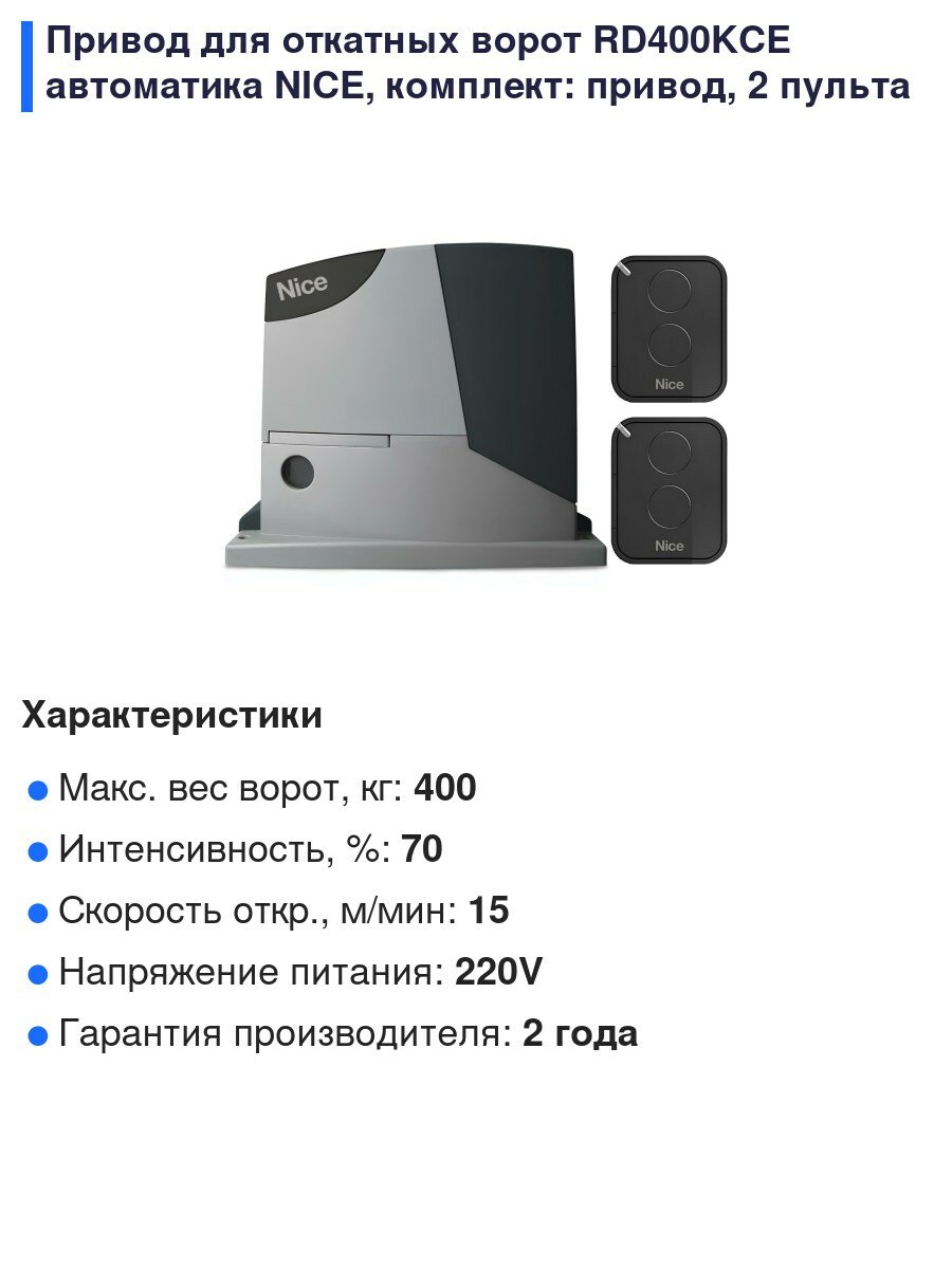 Привод для откатных ворот RD400KCE автоматика NICE, комплект: привод, 2 пульта