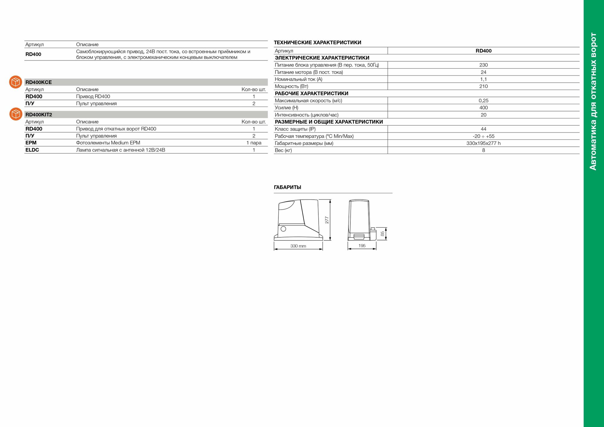 | Подробная комплектация | Привод для откатных ворот RD400KCE автоматика NICE, комплект: привод, 2 пульта - 1 шт, Зубчатая рейка для откатных ворот KR-8, M4 30х8х1000 мм, с крепёжным комплектом - 6 шт, Лампа сигнальная светодиодная с антенной ADL-2 - 1 шт, Фотоэлементы AIS-10 - 1 шт. |