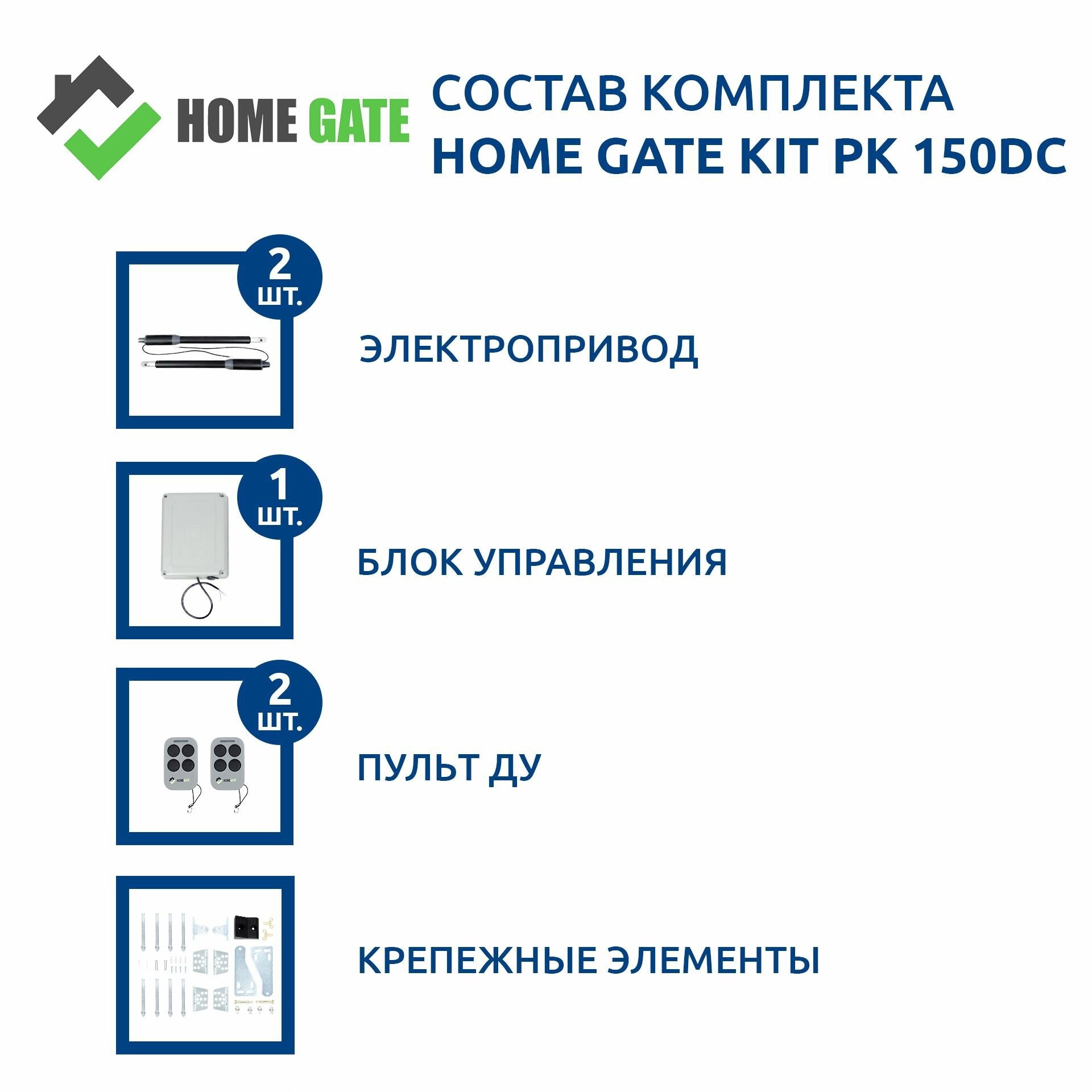 | Подробная комплектация | Home Gate 150DC Комплект линейных приводов на 24В 2шт, для распашных ворот с блоком управления и 2 пультами для створок до 2м, крепежный комплект |