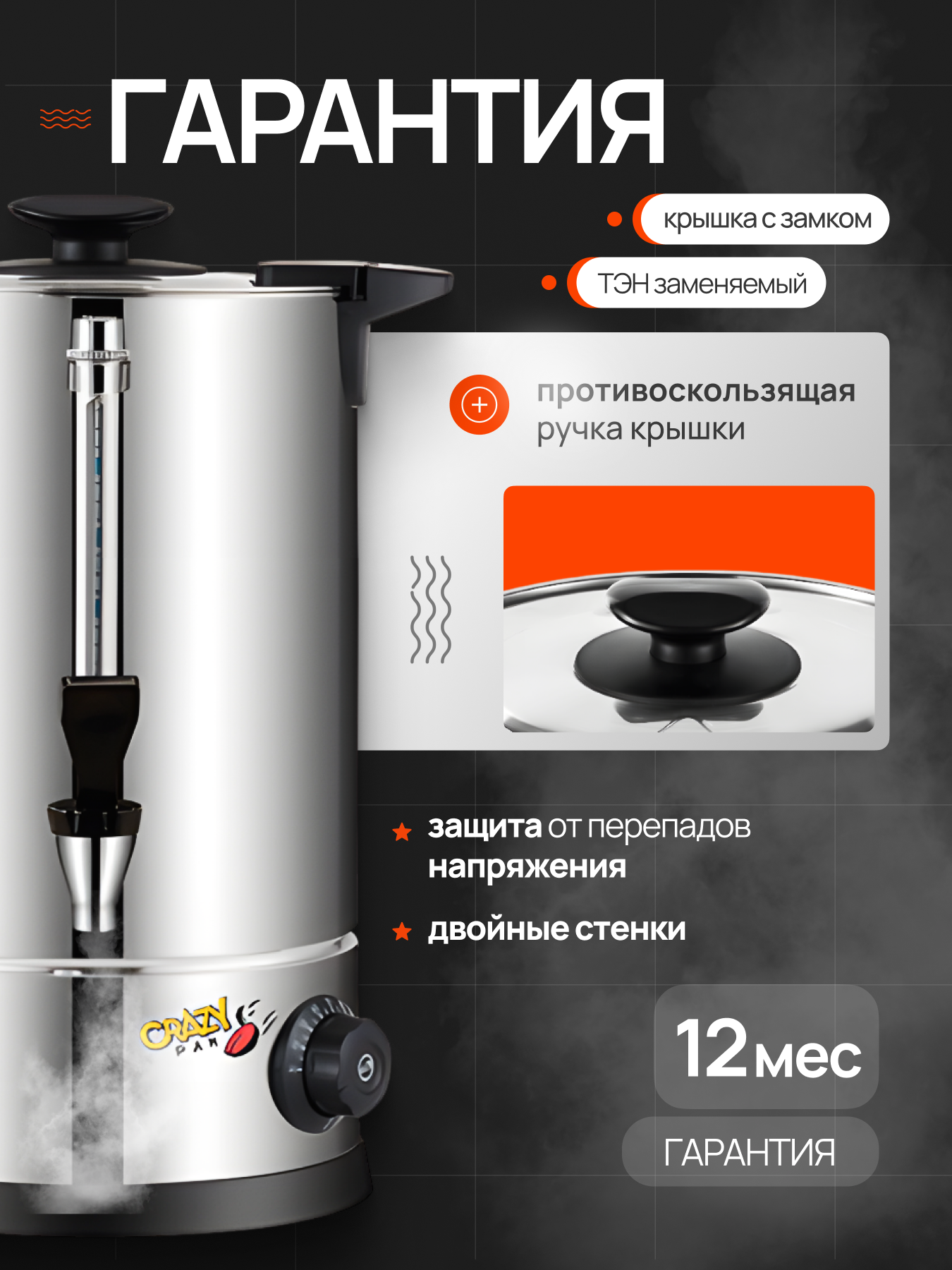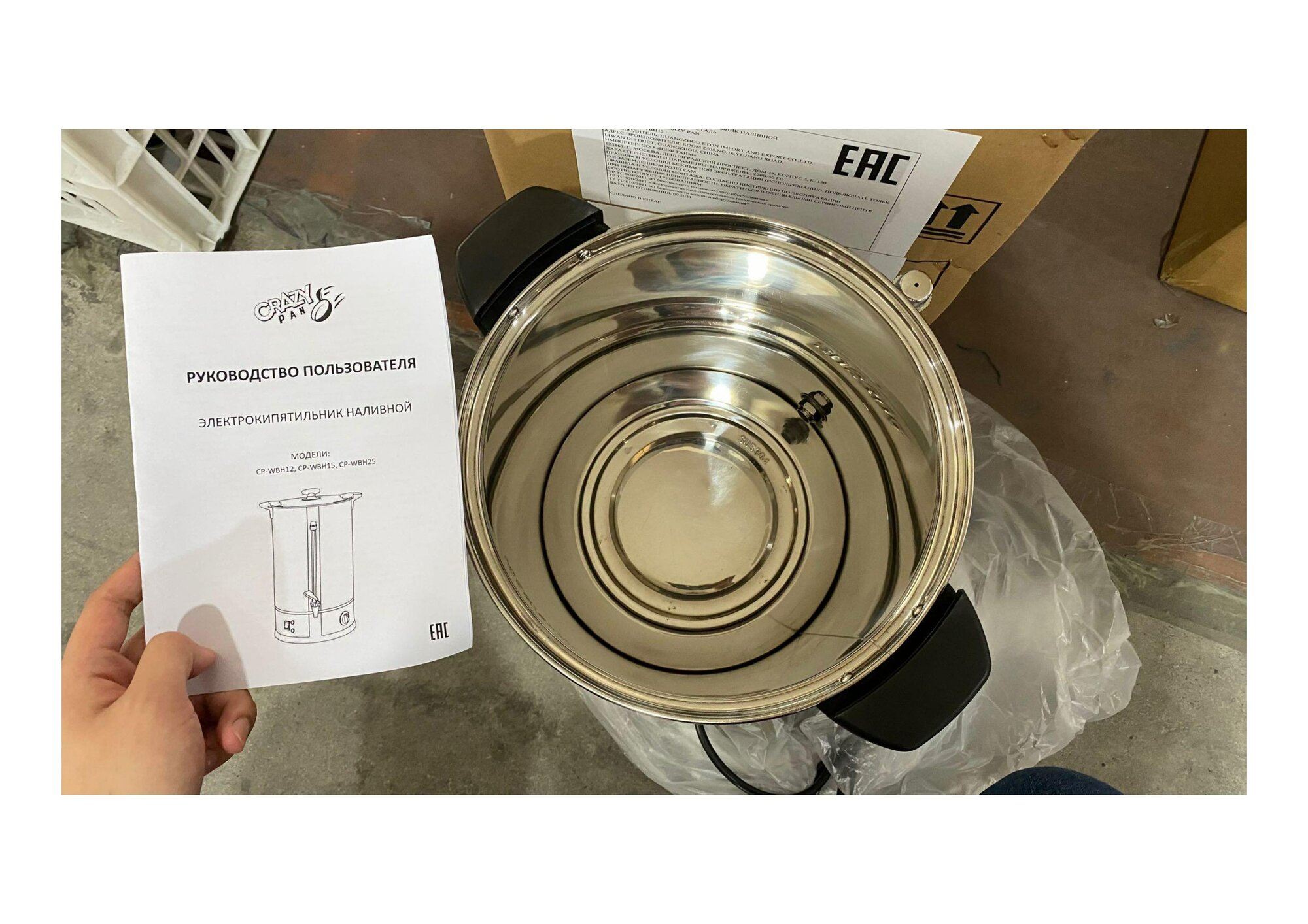 Электрокипятильник наливной 12л Crazy Pan CP-WBH12, 1.8кВт, температурный режим 30-110 С, 220-240 В/50 Гц интересное: