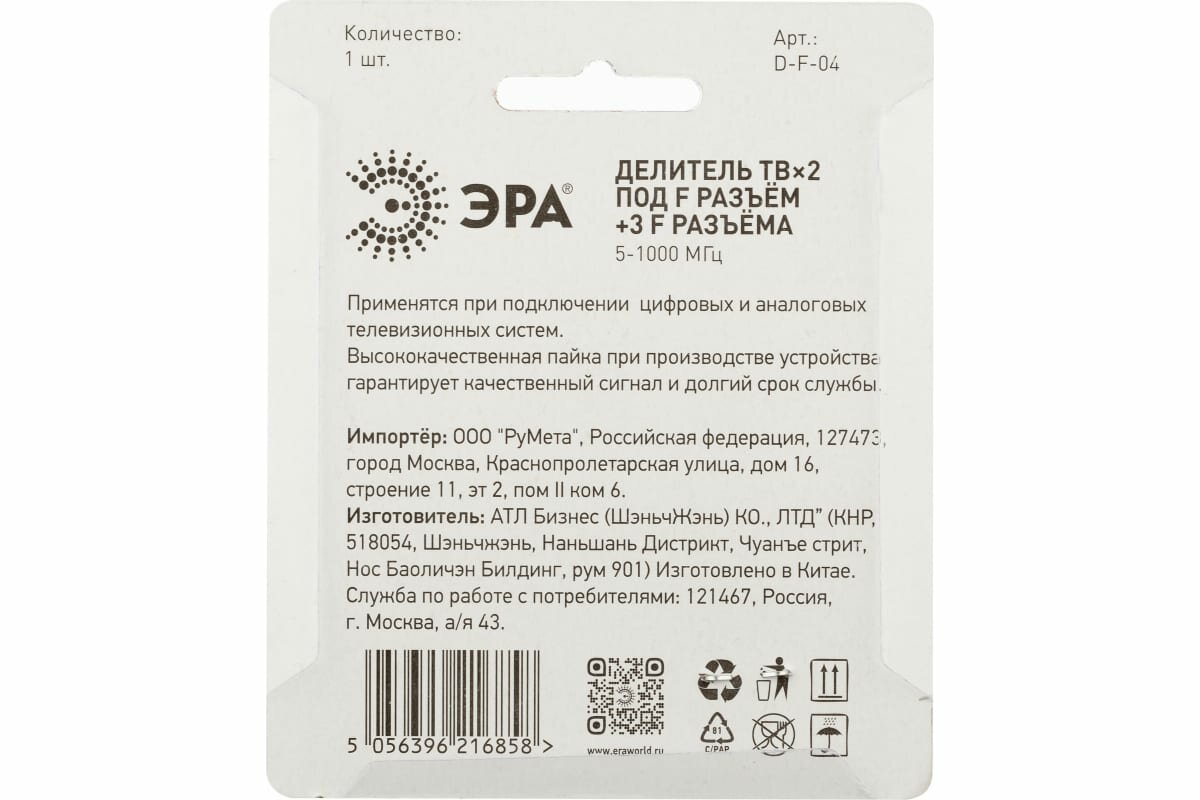ЭРА Делитель ТВ DF04 2 ответвления под F разъм в комплекте 3 F разъма 51000 МГц Б0048323 интересное: