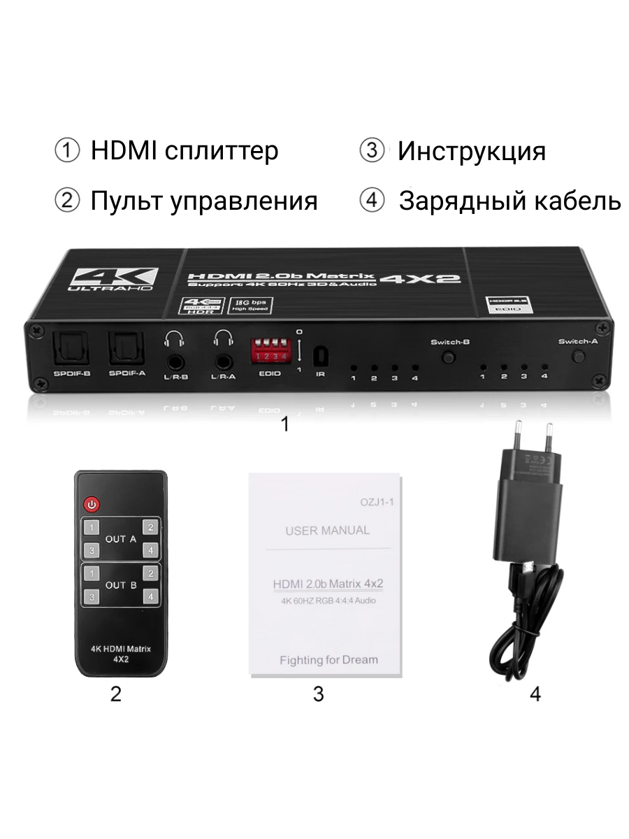 Матричный коммутатор (сплиттер свитчер) HDMI 4 входа 2 выхода 4K 60 Гц с двумя оптическими выходами Toslink (S/PDIF) и 3,5 jack интересное: