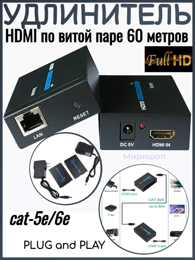 HDMI extender удлинитель по витой паре 60 метров cat-5e/6e интересное: