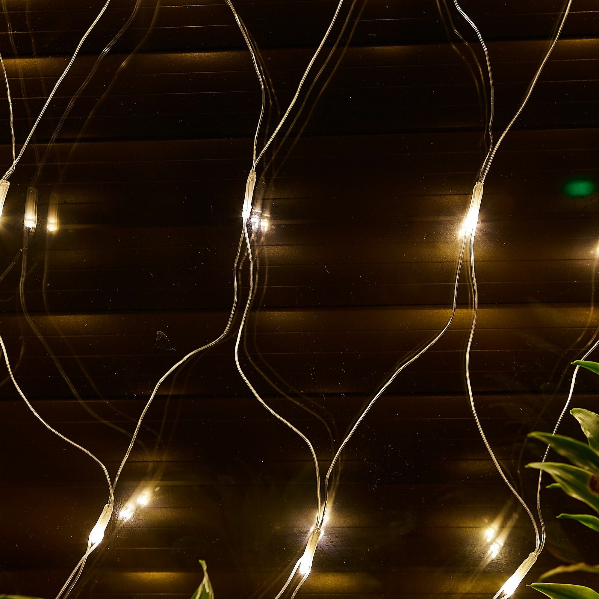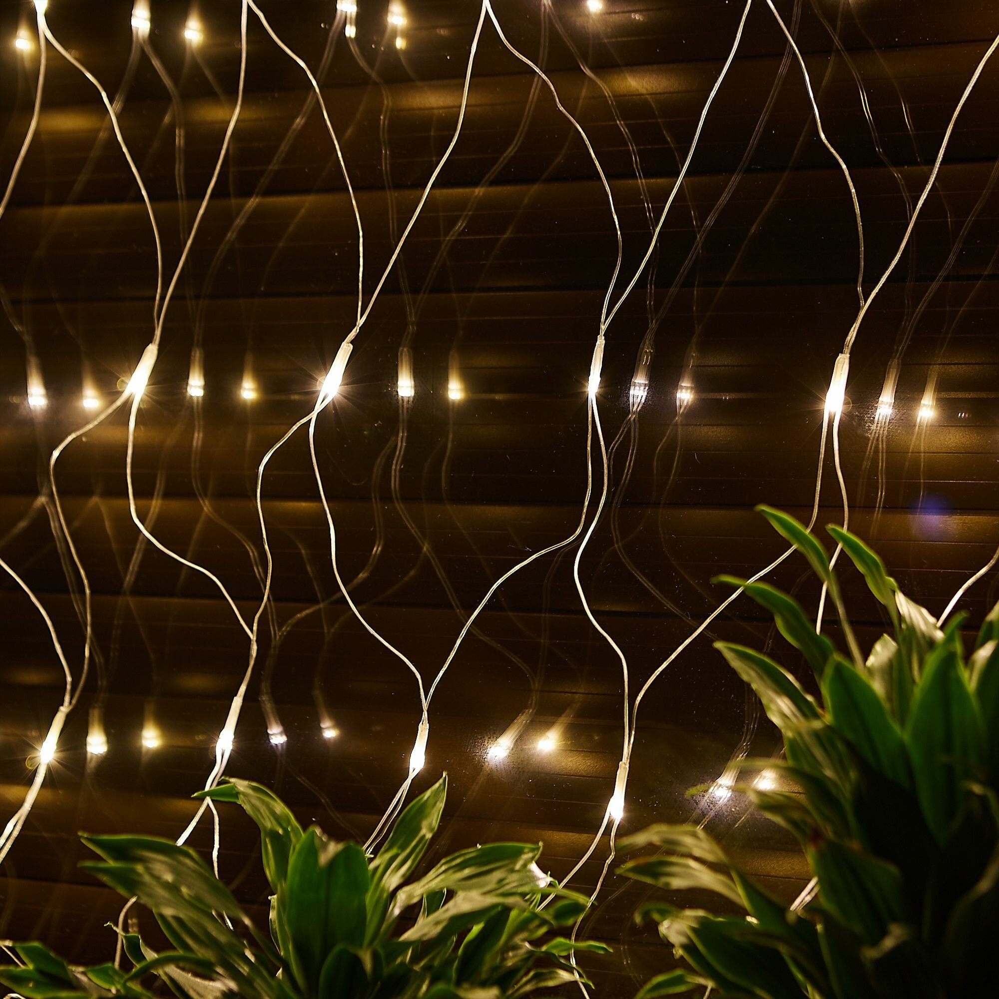Сетка светодиодная Uniel ULD-N1515-96/TTK WARM WHITE IP44 с эффектом мерцания, 1,5х1,5м. Соединяемая, 96 светодиодов. Теплый белый свет. Провод прозрачный.