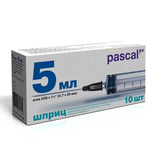 Шприц pascal' (паскаль') 3х-компонентный с иглой 5 мл 0,7x30 мм. 10 шт.