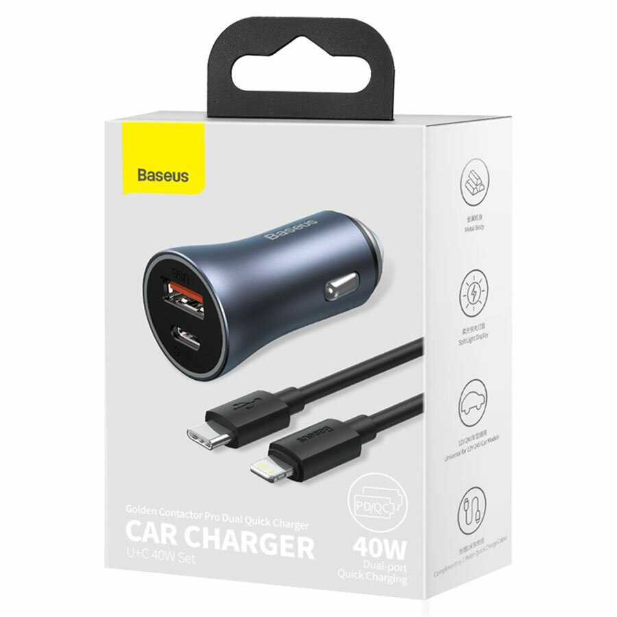 Автомобильное зарядное устройство Baseus Golden Contactor Pro Dual Quick Charger (TZCCJD-B0G), USB + USB Type-C, 40W + кабель USB Type-C - Lightning, 1м, темно-серый