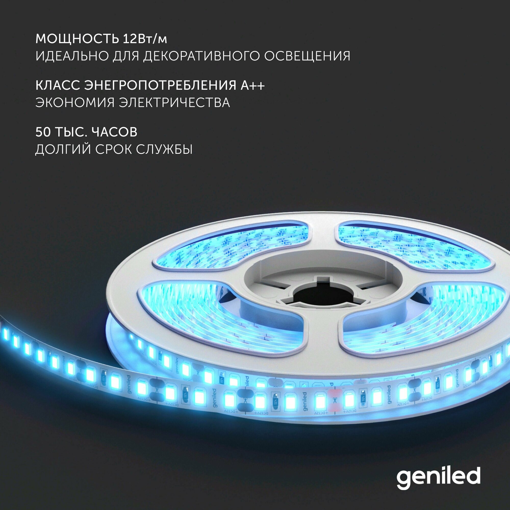 Светодиодная лента, подсветка Geniled - для комнаты, в гардероб, на кухню - Синий свет / GL-120SMD2835 / 12В / Длина - 5м / B - 8 мм / W - 12Вт / Blue / IP33