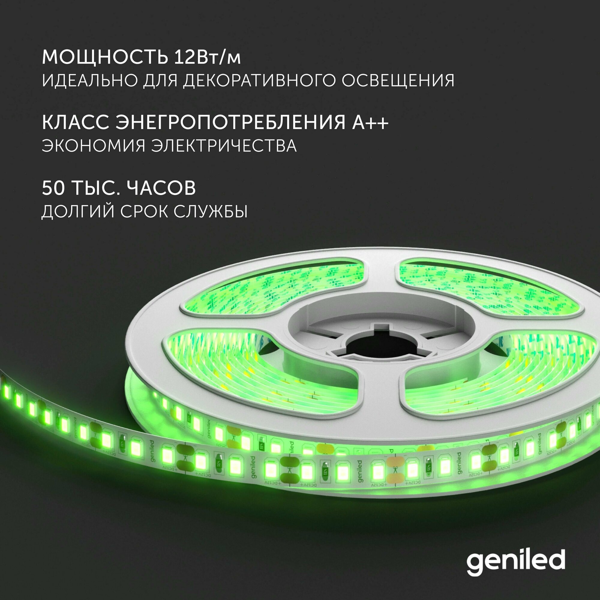 Светодиодная лента Geniled - Зеленый свет / GL-120SMD2835 / 12 В / L - 5 м / B - 8 мм / W - 12 вт / Green / IP33