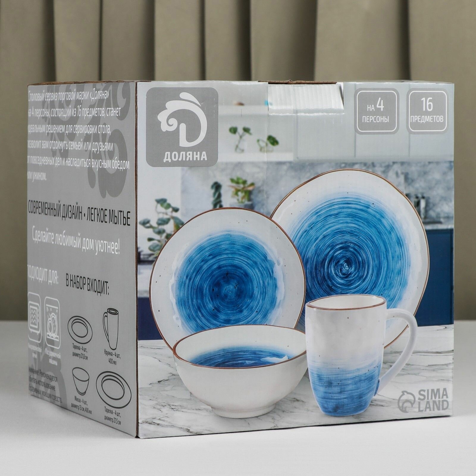 Купить Сервиз столовый 16 пред"Ио" 4 тар 21 см, 4 тар 27,5 см, 4 мисок 13 см, 4 кружки 400 мл Доляна 712989 .