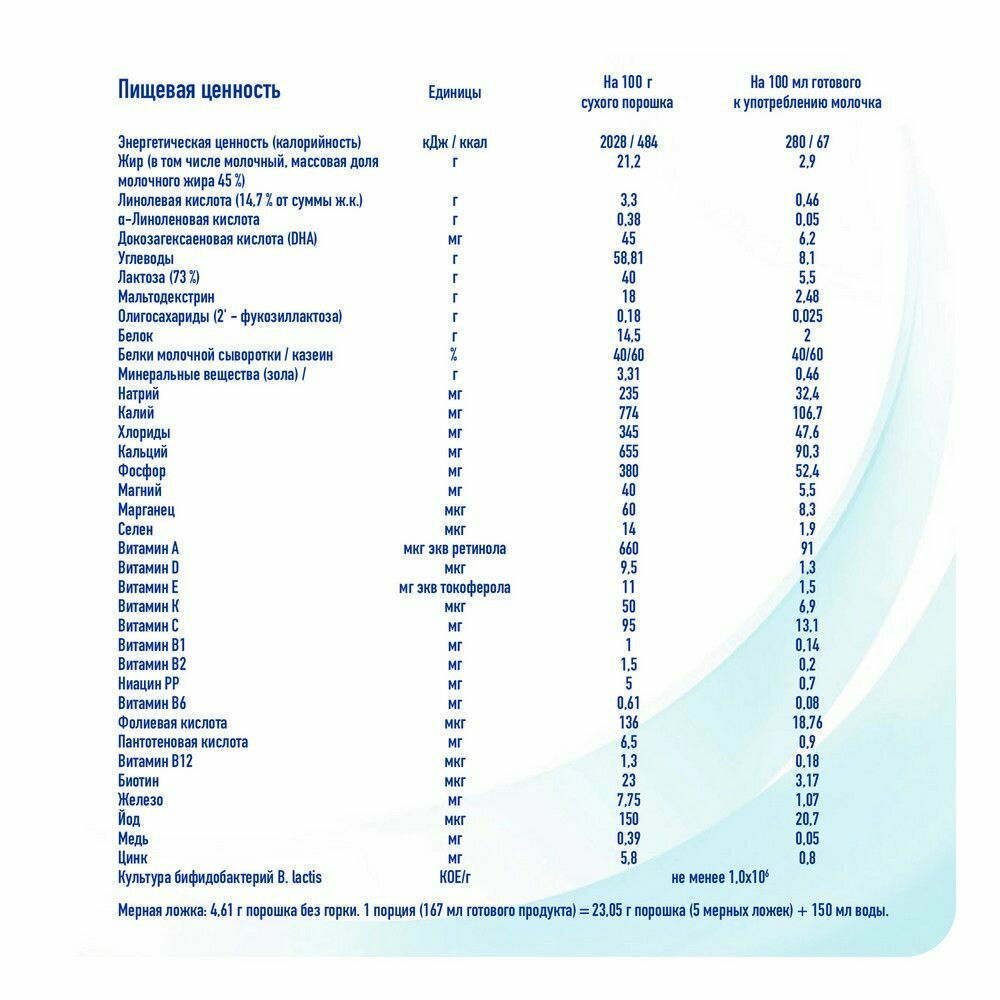Из плюсов состава для себя выявила: не содержит пальмовое масло и сахар. Хотя многая продукция с раннего детского возраста уже содержит сахар. Смесь обогащенная пробиотиками и олигосахаридами, максимально приближена к грудному молоку. Богатый витаминный состав. Есть место для ложечки, есть сама мерная ложечка. Смесь хорошо разводится, растворяется без комочков. Очень хорошая добротная банка, в ней смесь хорошо сохраняется, не попадает влага. |