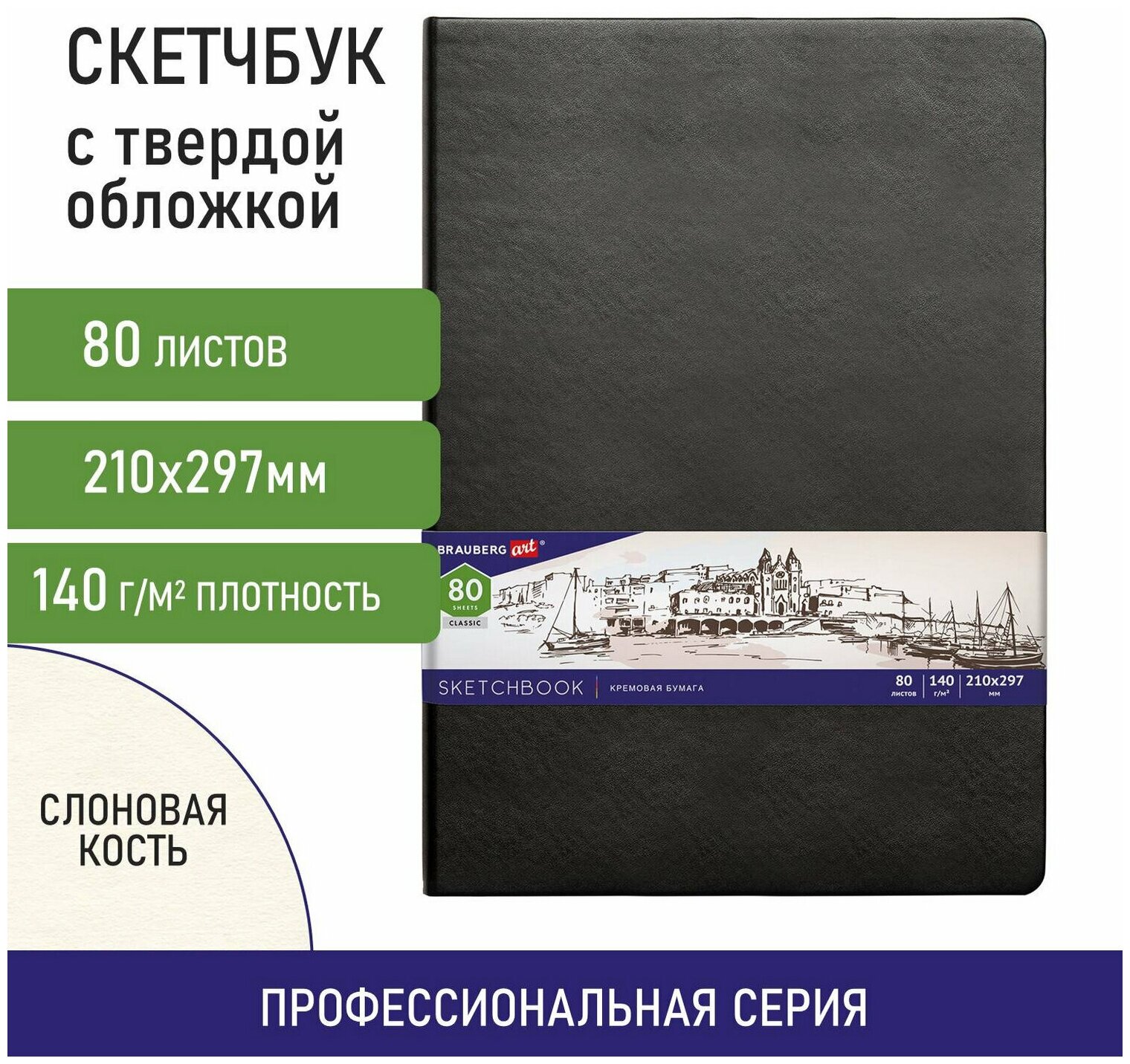 Скетчбук, слоновая кость 140г/м 210х297мм, 80л, кожзам, резинка, BRAUBERG ART_CL, черный, 113200