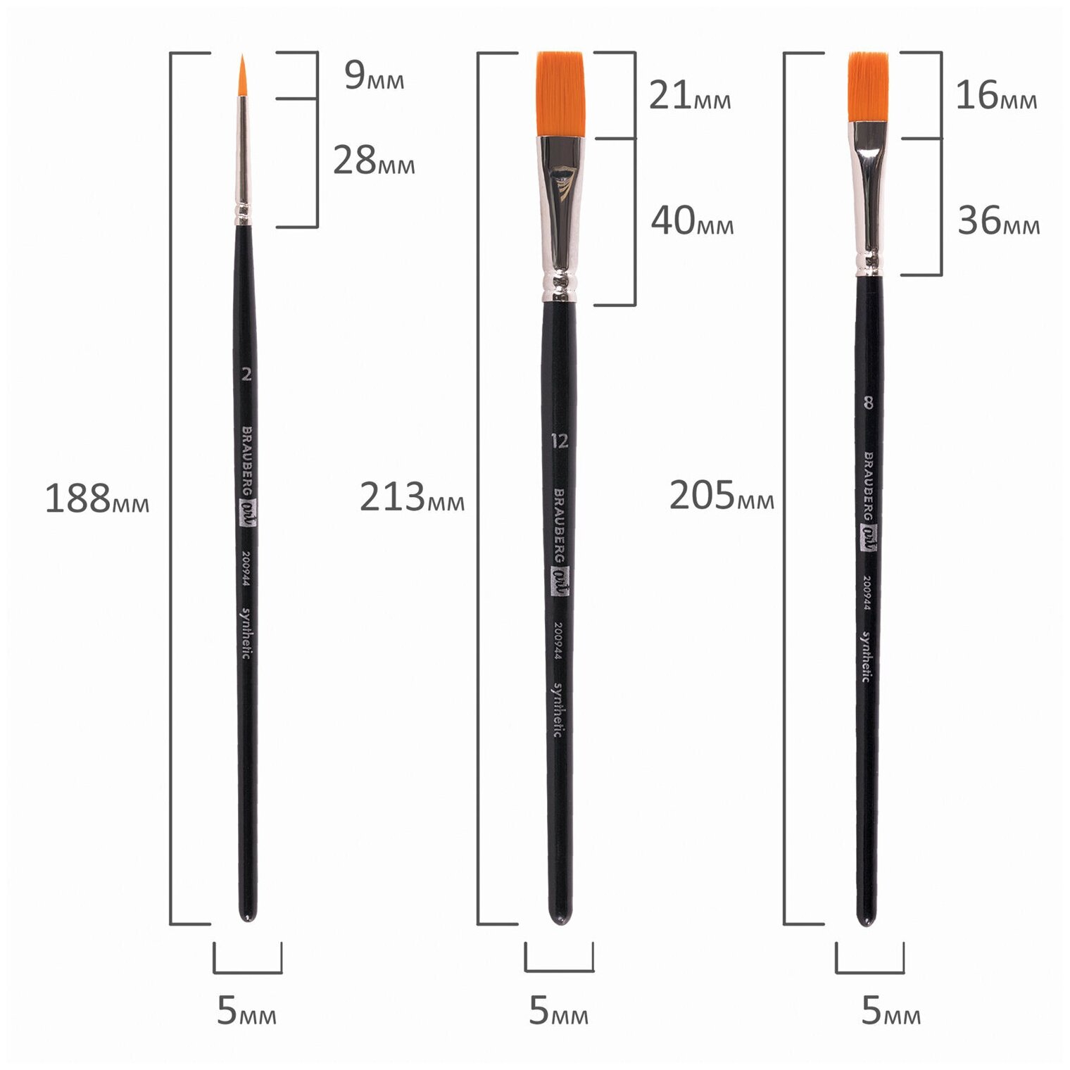 200944, Кисти художественные BRAUBERG ART CLASSIC, набор 3 штуки, синтетика (круглая № 2, плоские № 8, 12), 200944