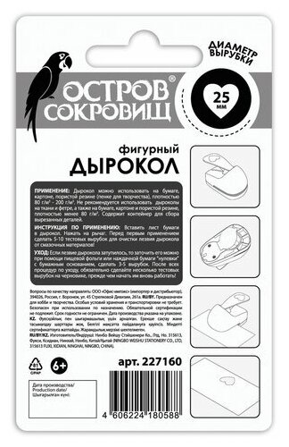 Дырокол фигурный "Сердце", диаметр вырезной фигуры 25 мм, остров сокровищ, 227160 В комплекте: 1шт.