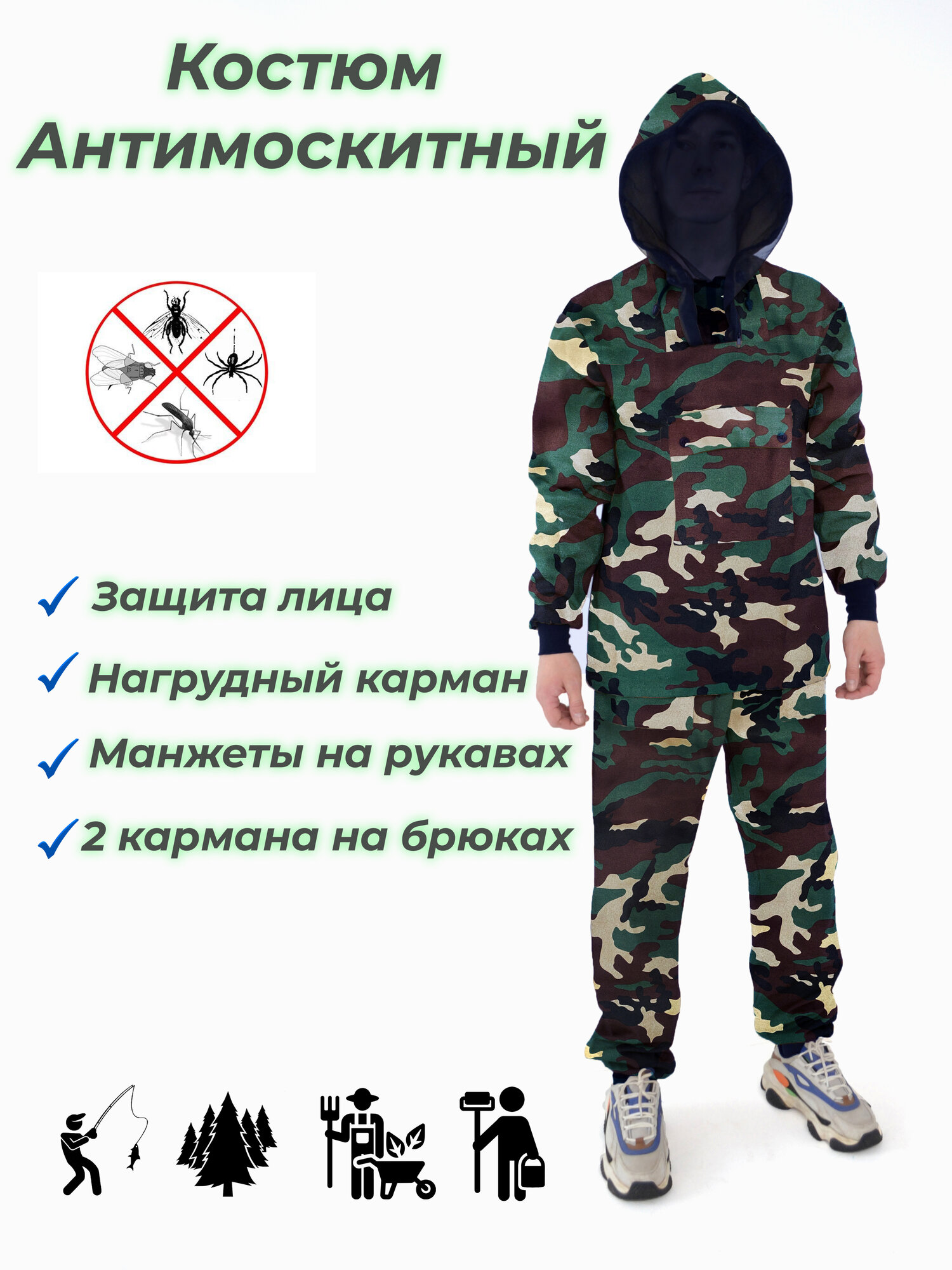| Плюсы: | Удобный костюм с защитной сеткой от комаров. |