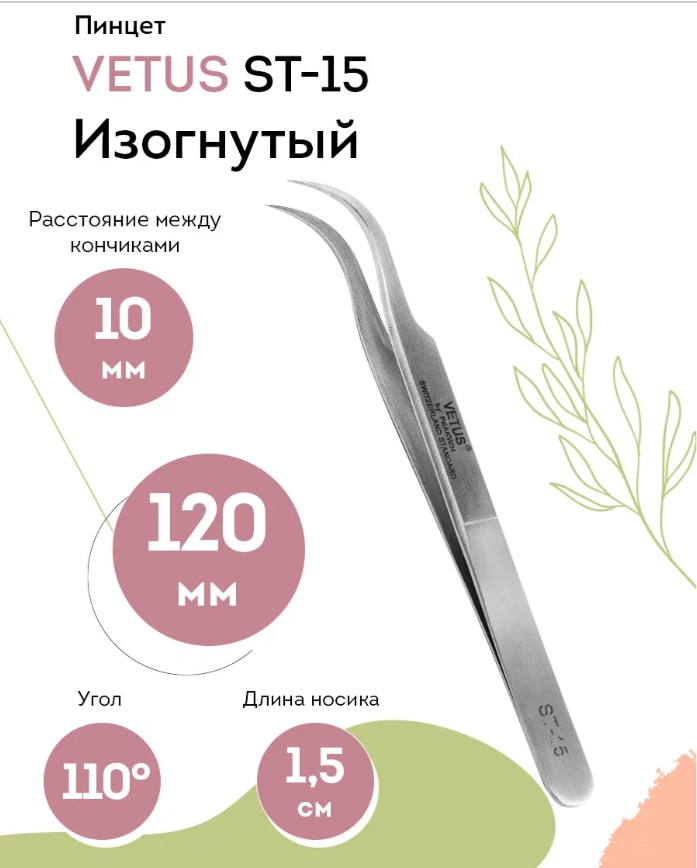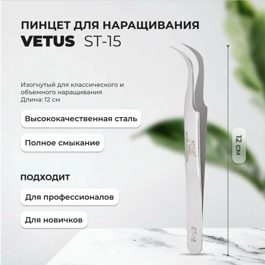 VETUS Пинцет для наращивания ресниц изогнутый ST-15, длина 11,6 см интересное: