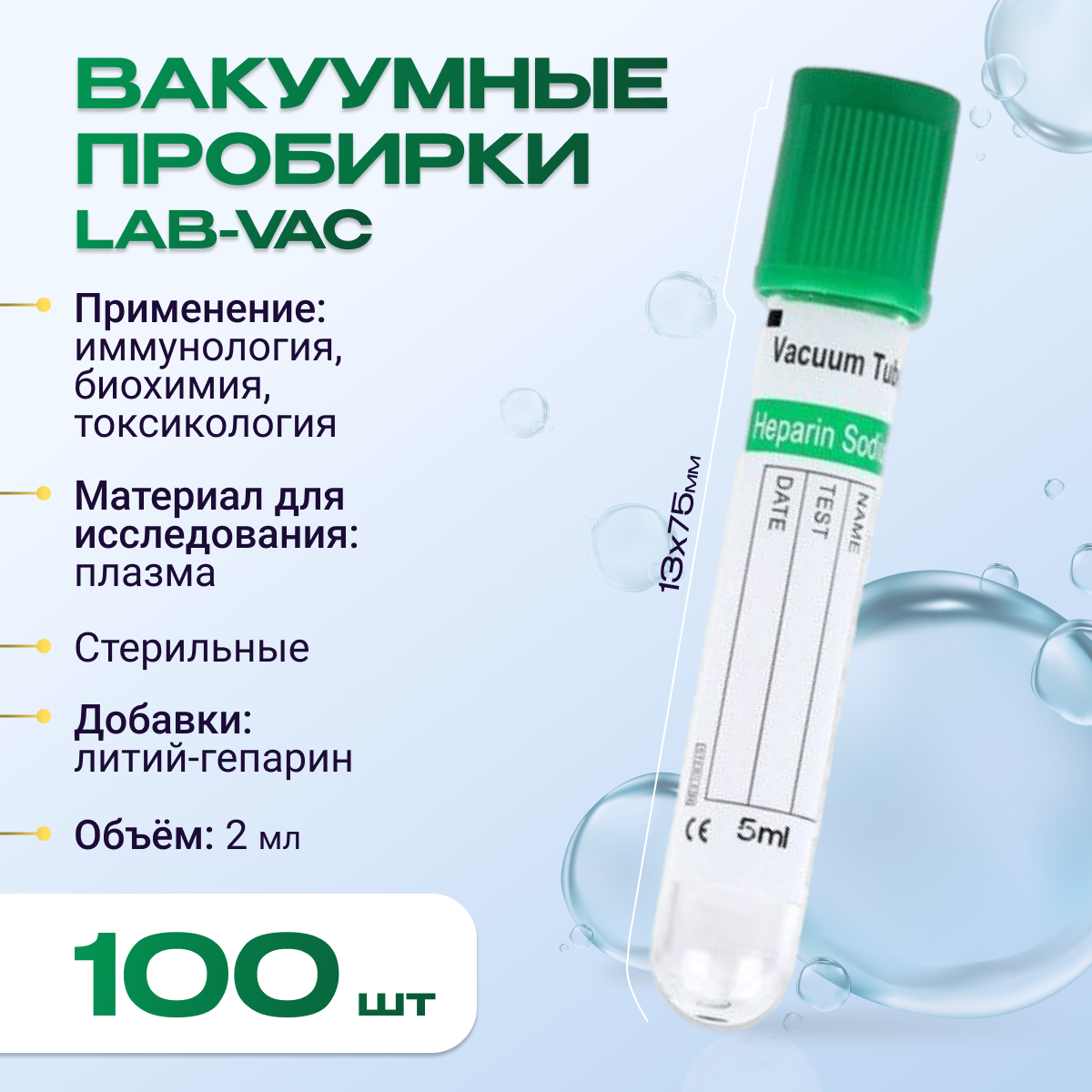 Пробирка вакуумная 2 мл с литий гепарином 13х75 мм Lind-Vac зеленая, 100 шт интересное: