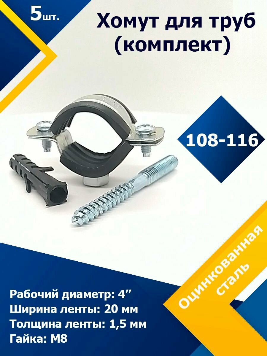 Купить Хомут обрезиненный для труб (комплект) 4 дюйма (108-116 мм) М8 (5 шт.)