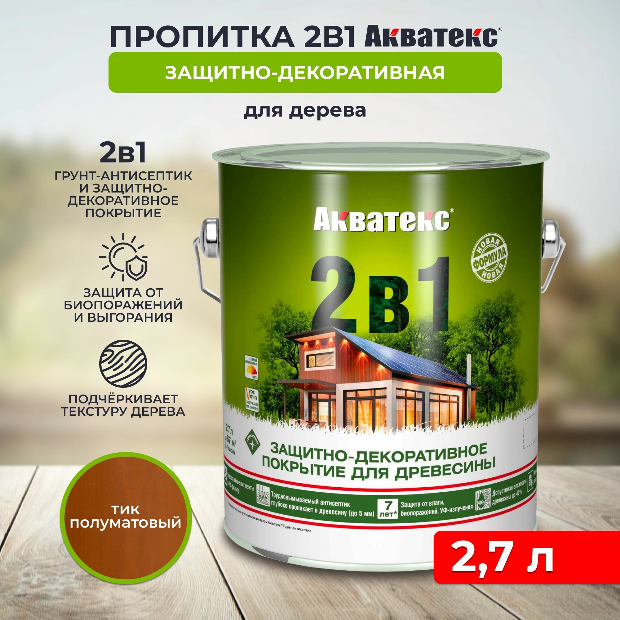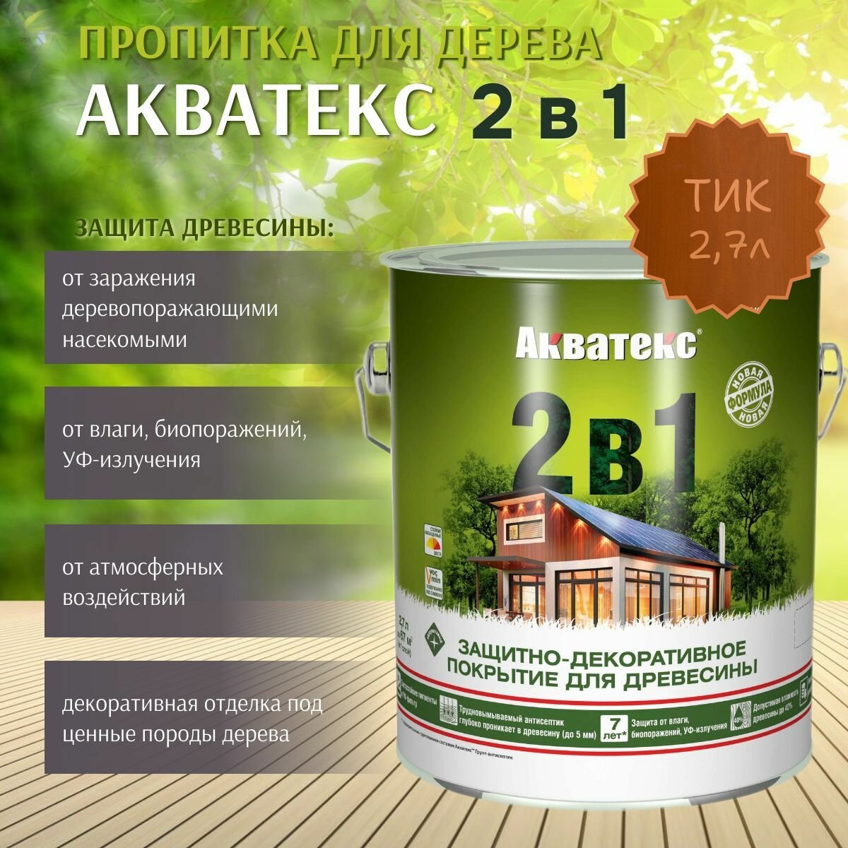 Защитно-декоративное Акватекс покрытие для древесины, пропитка по дереву, 2в1, тик, 2,7 л