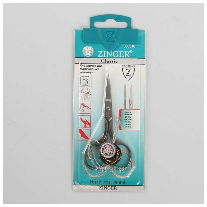 ZINGER Ножницы маникюрные, прямые, 9,5 см, на блистере, цвет серебристый, B-105-S-SH