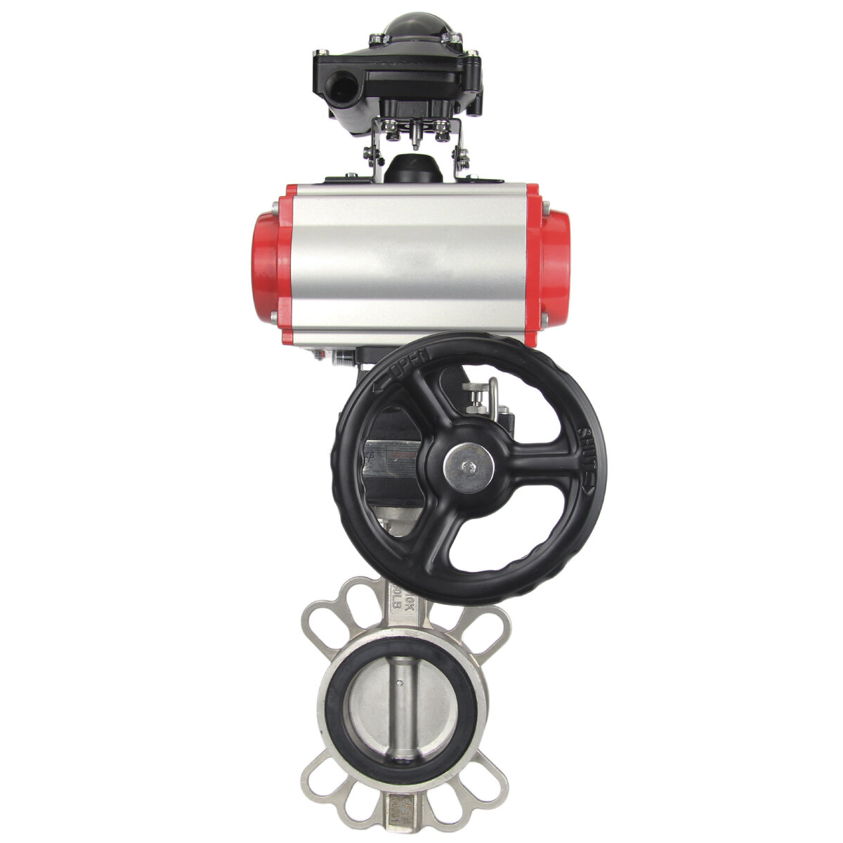 Затвор DN.ru 316L-316L-EPDM Ду300 Ру16, корпус - нержавеющая сталь 316L, диск - нержавеющая сталь 316L, уплотнение - EPDM, с пневмоприводом DN.ru DA-140, с пневмораспределителем 4M310-08 220V, с блоком концевых выключателей APL-210N и ручным дублером HDM-