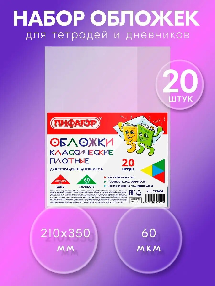 СохранитьОбложки ПП для тетради и дневника пифагор, комплект 20 шт., прозрачные, плотные, 60 мкм, 210х350 мм, 223486 (цена за 1 ед.товара) интересное: