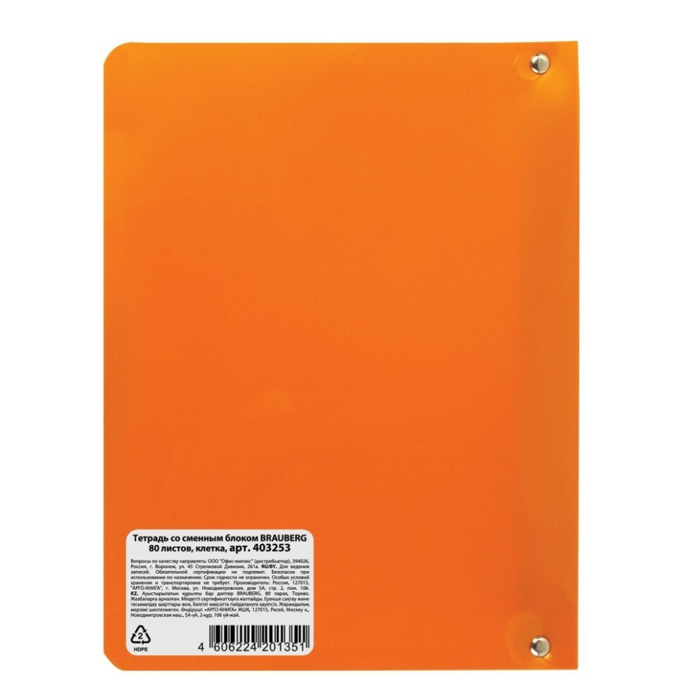 Тетрадь на кольцах со сменным блоком для учебы А5 (160х215 мм), 80 л., пластиковая обложка, клетка, Brauberg, Оранжевый