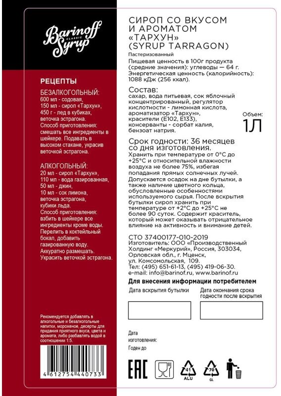 Barinoff Сироп БАРinoff «Тархун», 1 л