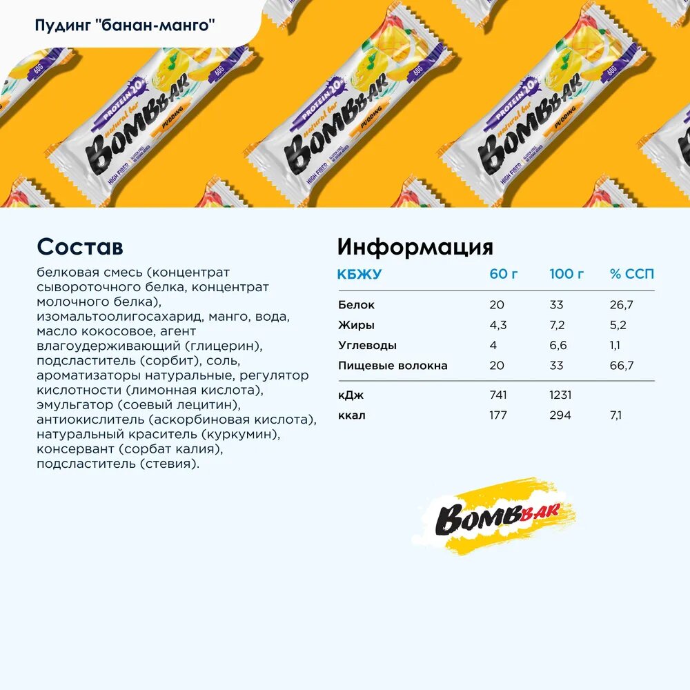 Протеиновый батончик Bombbar без сахара, Пудинг банан-манго, 60г х 12 шт.