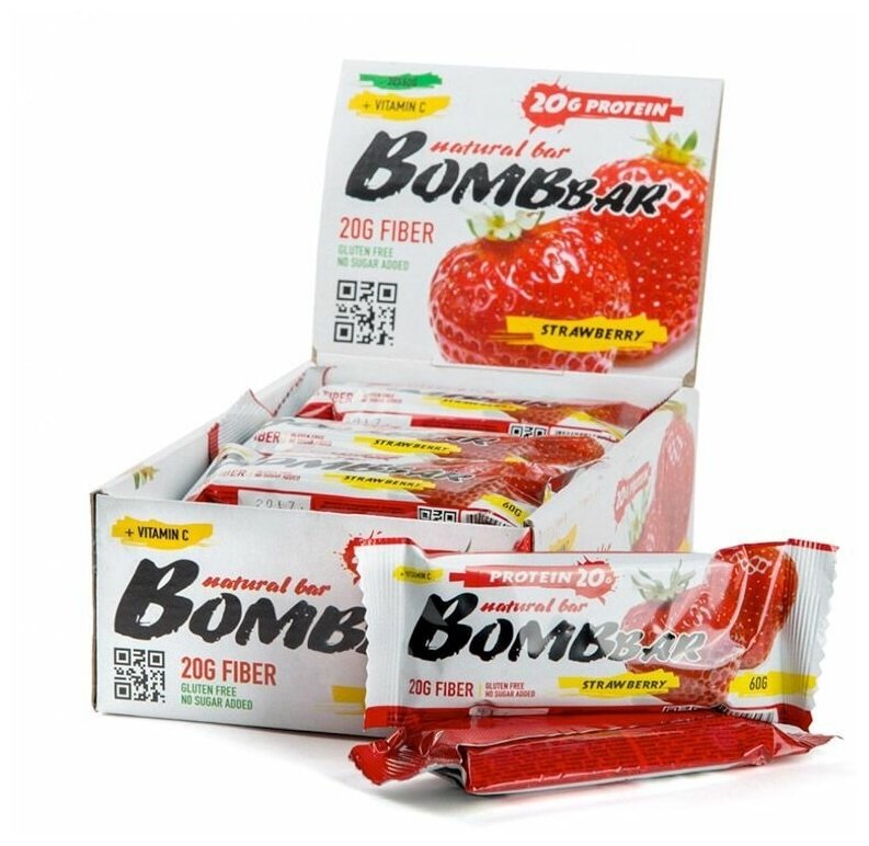 Bombbar Набор батончиков неглазированных протеиновых, вкус клубника 20 штук по 60 г