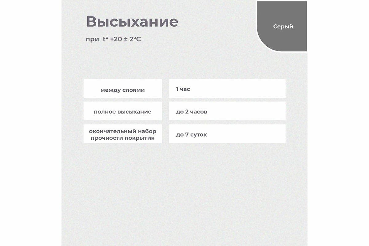 | Дополнительная информация | температура применения от +10°С, относительная влажность воздуха менее 70%; Время высыхания (при t° +20±2°C): межслойная сушка на вертикальных поверхностях – 1 час; межслойная сушка на горизонтальных поверхностях – до 2 часов; окончательный набор прочности покрытия - до 7 суток |