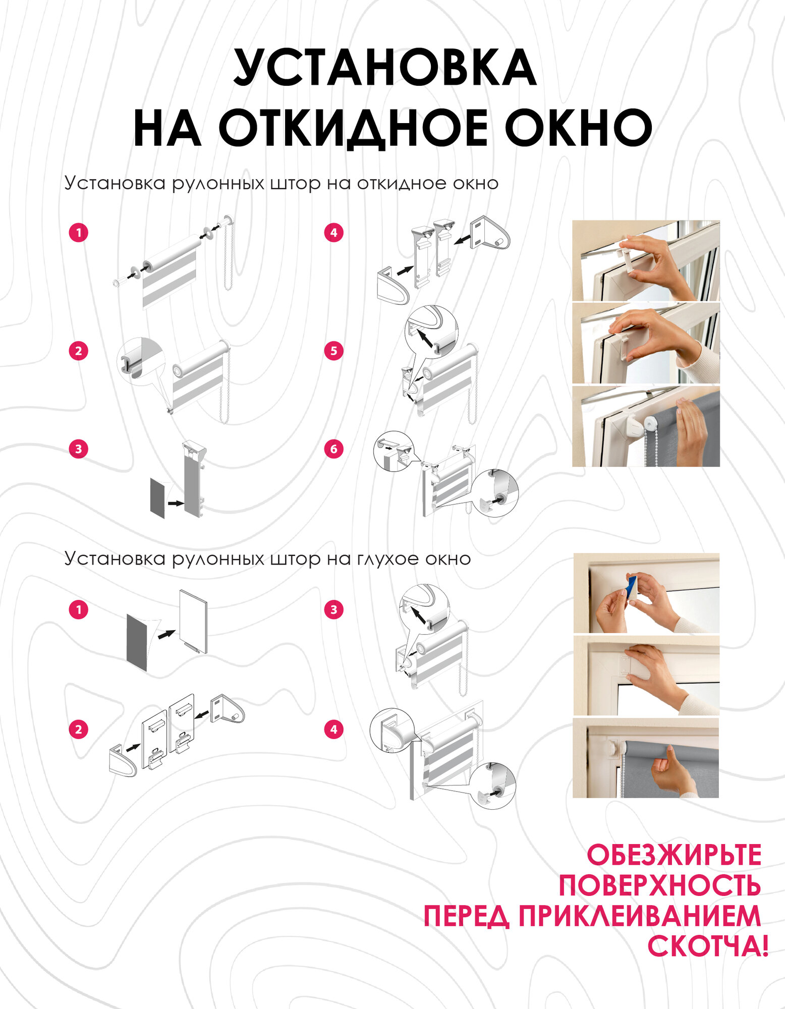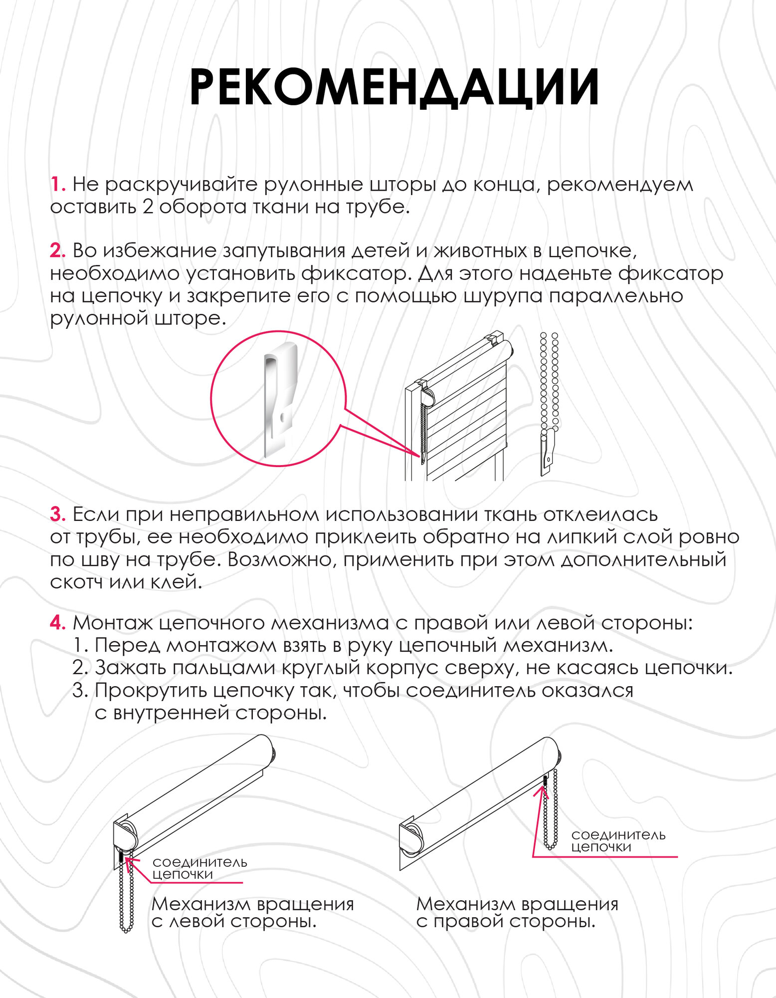 | Комплектация | штора "День-ночь" с трубой, ограничитель, цепочный механизм с заглушкой, заглушка-фиксатор, фиксирующая профильная планка, держатели, площадка с двусторонним скотчем, утяжелитель, навесной кронштейн, зажим, шурупы, фиксатор для цепочки |