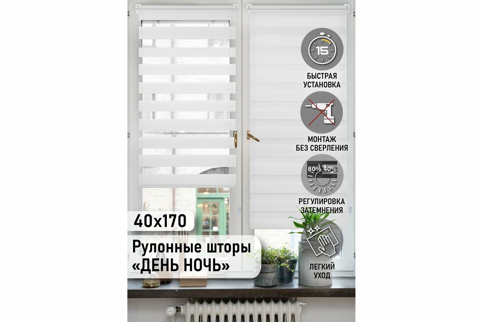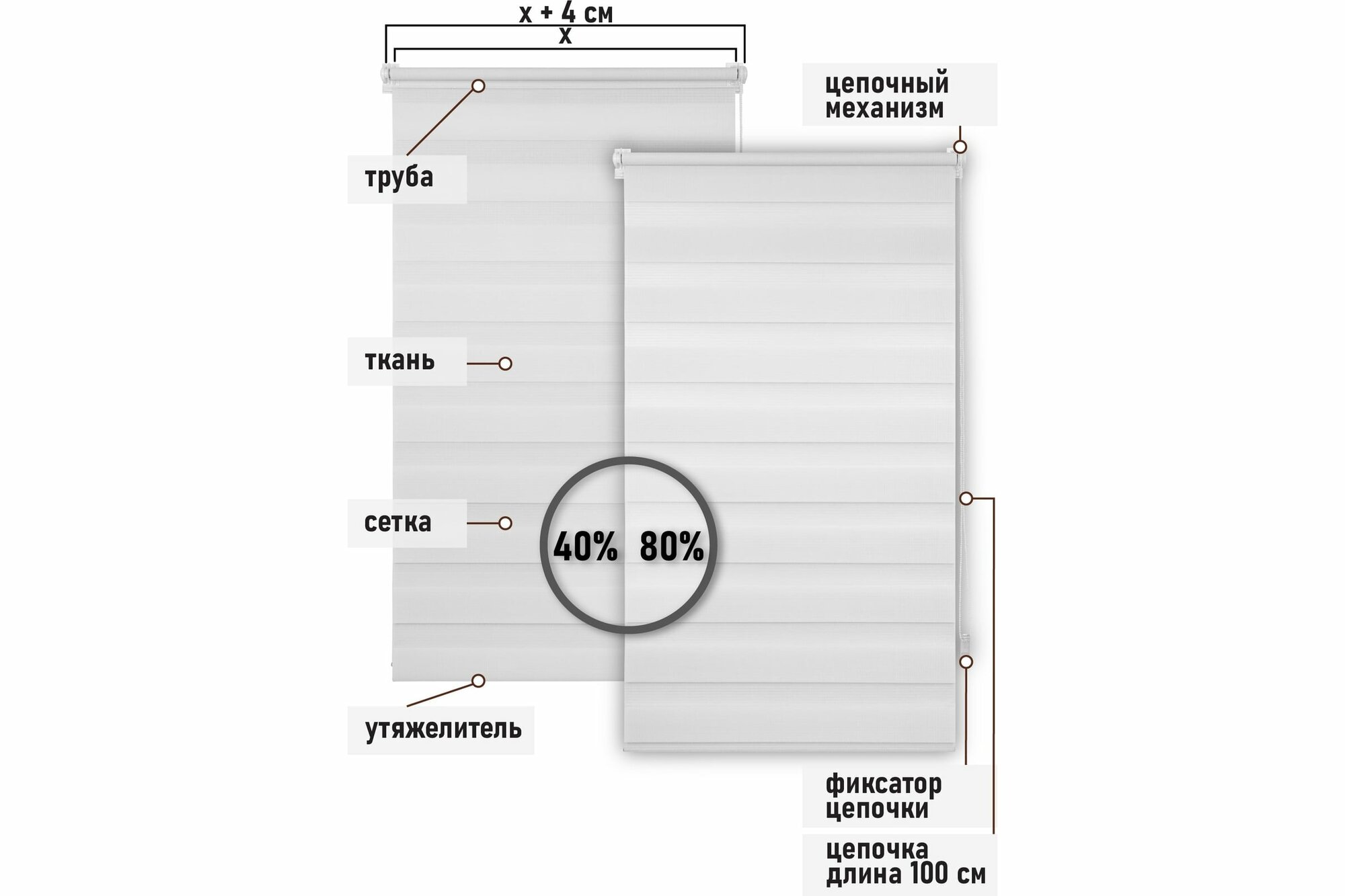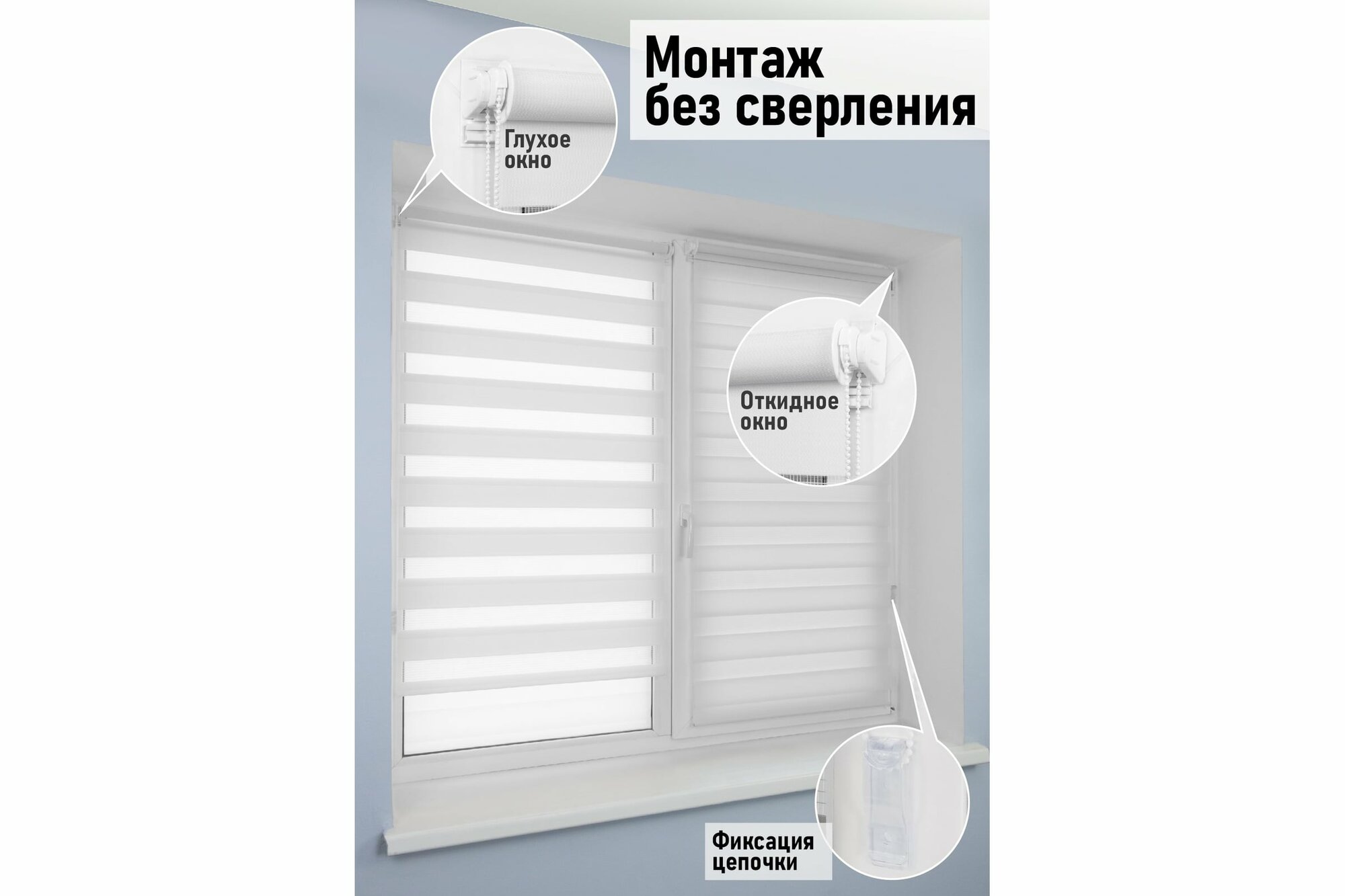 | Комплектация | штора "День-ночь" с трубой, ограничитель, цепочный механизм с заглушкой, заглушка-фиксатор, фиксирующая профильная планка, держатели, площадка с двусторонним скотчем, утяжелитель, навесной кронштейн, зажим, шурупы, фиксатор для цепочки |