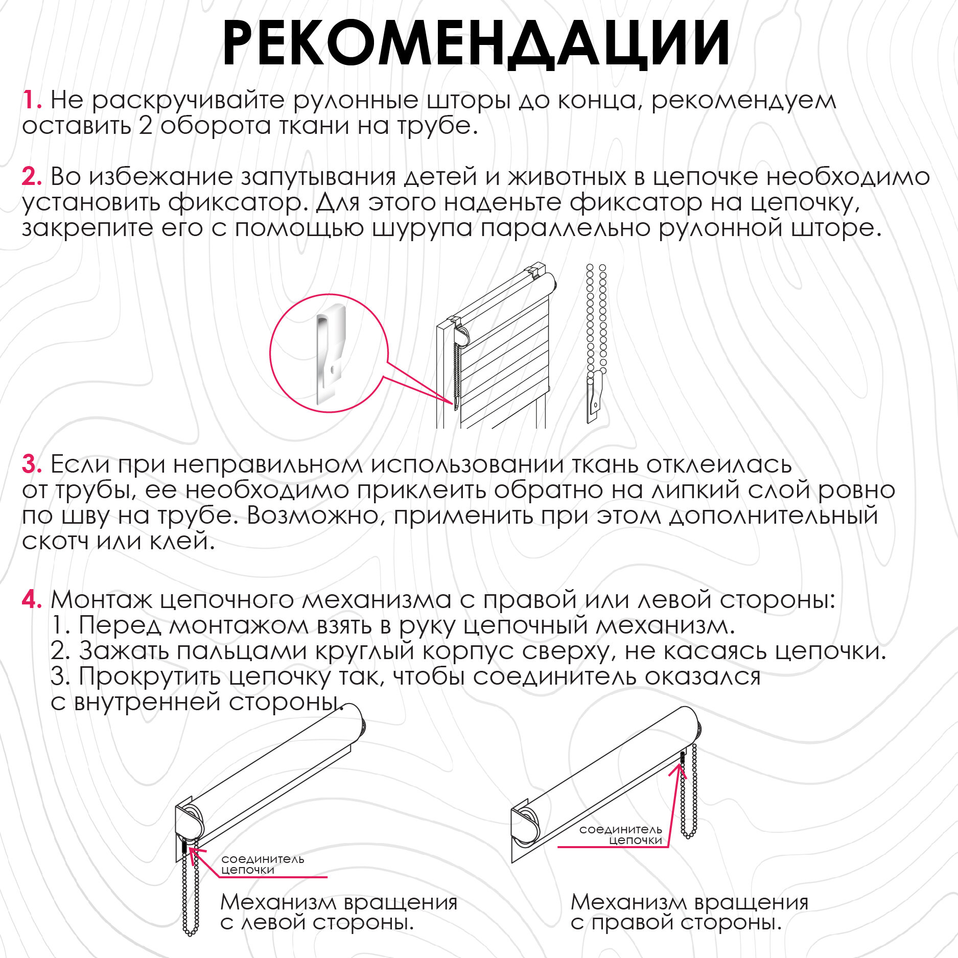 | Комплектация | штора "День-ночь" с трубой, ограничитель, цепочный механизм с заглушкой, заглушка-фиксатор, фиксирующая профильная планка, держатели, площадка с двусторонним скотчем, утяжелитель, навесной кронштейн, зажим, шурупы, фиксатор для цепочки |
