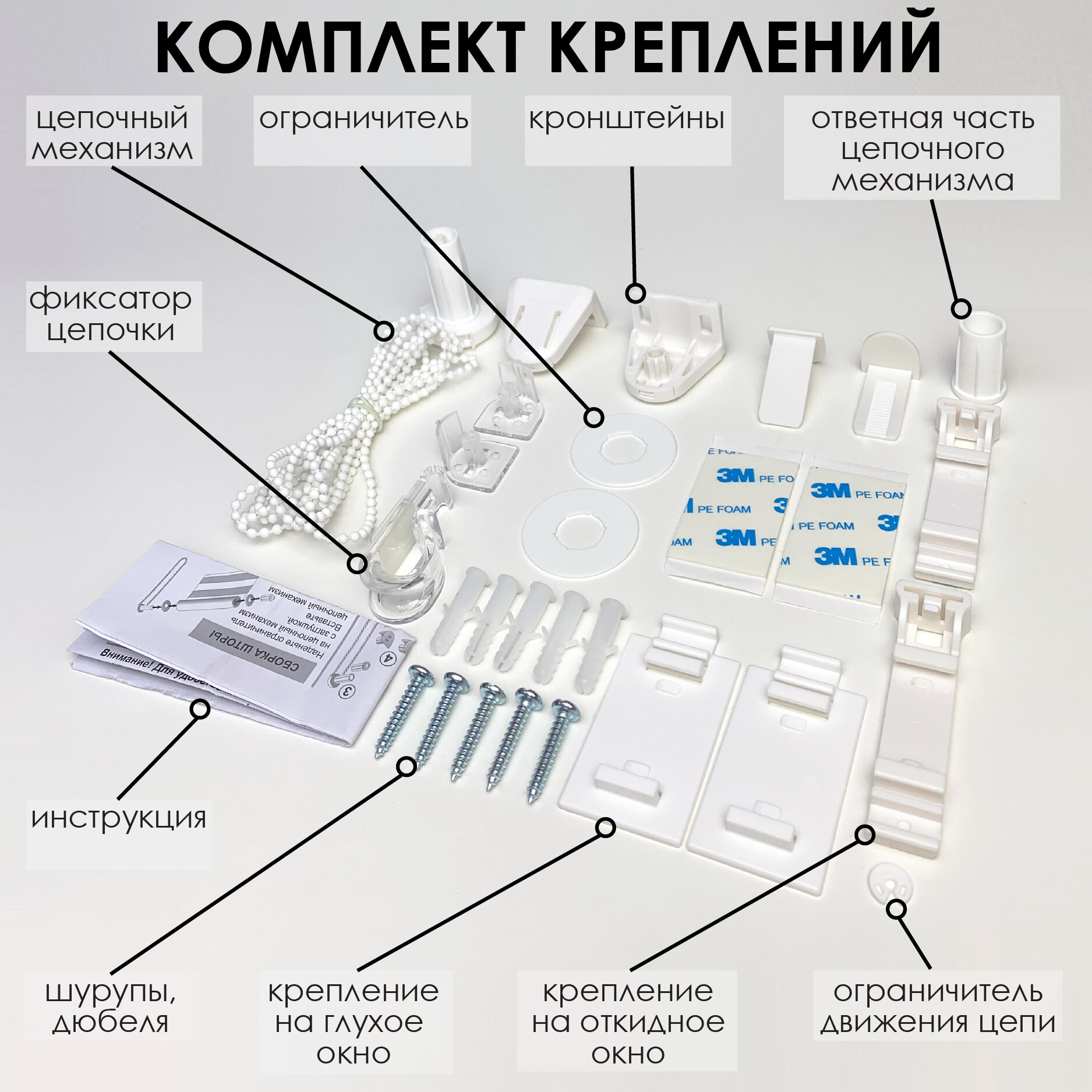 | Комплектация | штора "День-ночь" с трубой, ограничитель, цепочный механизм с заглушкой, заглушка-фиксатор, фиксирующая профильная планка, держатели, площадка с двусторонним скотчем, утяжелитель, навесной кронштейн, зажим, шурупы, фиксатор для цепочки |